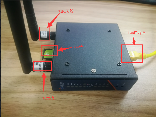 2、 接線:電腦通過網(wǎng)線連接 USR-806 的 LAN 口,WiFi 天線、全頻天線依次接在對(duì)應(yīng)的天線接口上