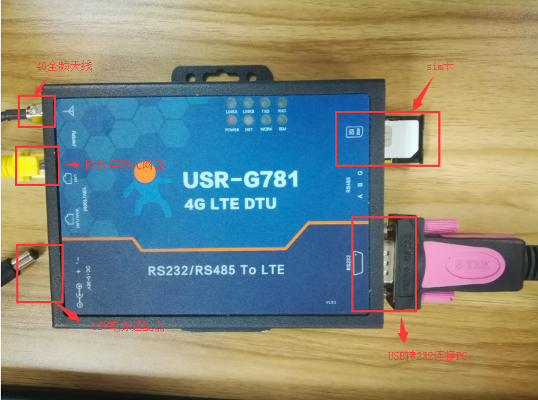 用USB轉(zhuǎn)串口線將G781的232串口連接到電腦,正確安裝天線,用我司配套電源適配器鏈接供電。如下圖所示: