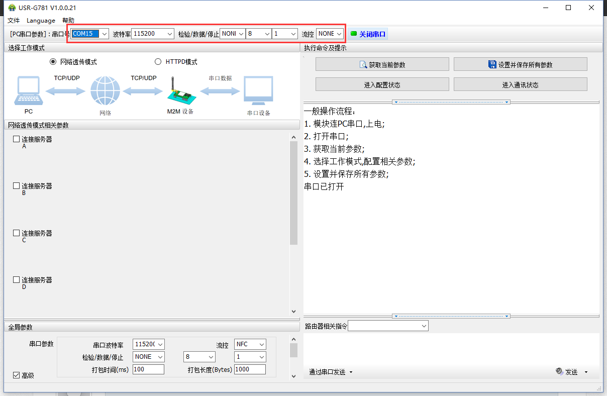 打開(kāi)配置軟件 G781出廠默認(rèn)串口參數(shù):波特率115200,檢驗(yàn)/數(shù)據(jù)/停止:NONE/8/1.如下圖所示,打開(kāi)串口: