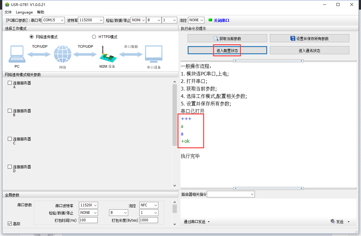 點(diǎn)擊進(jìn)入配置狀態(tài)。若如下圖所示打印+++ a a OK,則表示正確進(jìn)入配置狀態(tài)。若未顯示如下圖所示打印信息,可能原因: