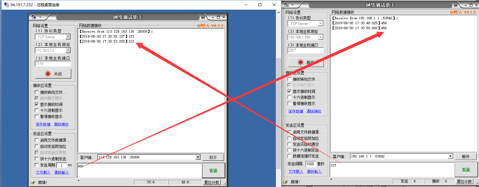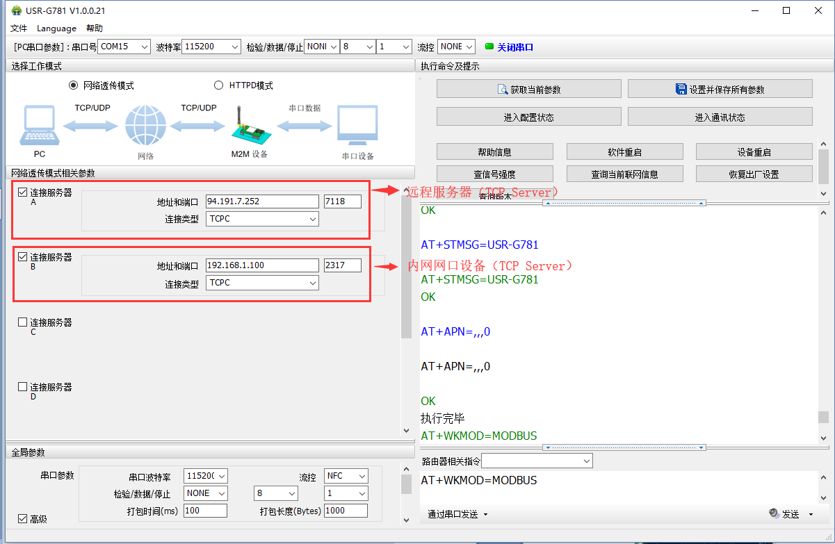 服務(wù)器B地址為LAN口設(shè)備IP及監(jiān)聽(tīng)端口。如192.168.1.100、2317(本案例用PC模擬網(wǎng)口設(shè)備)