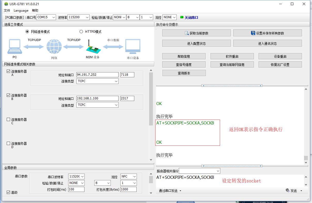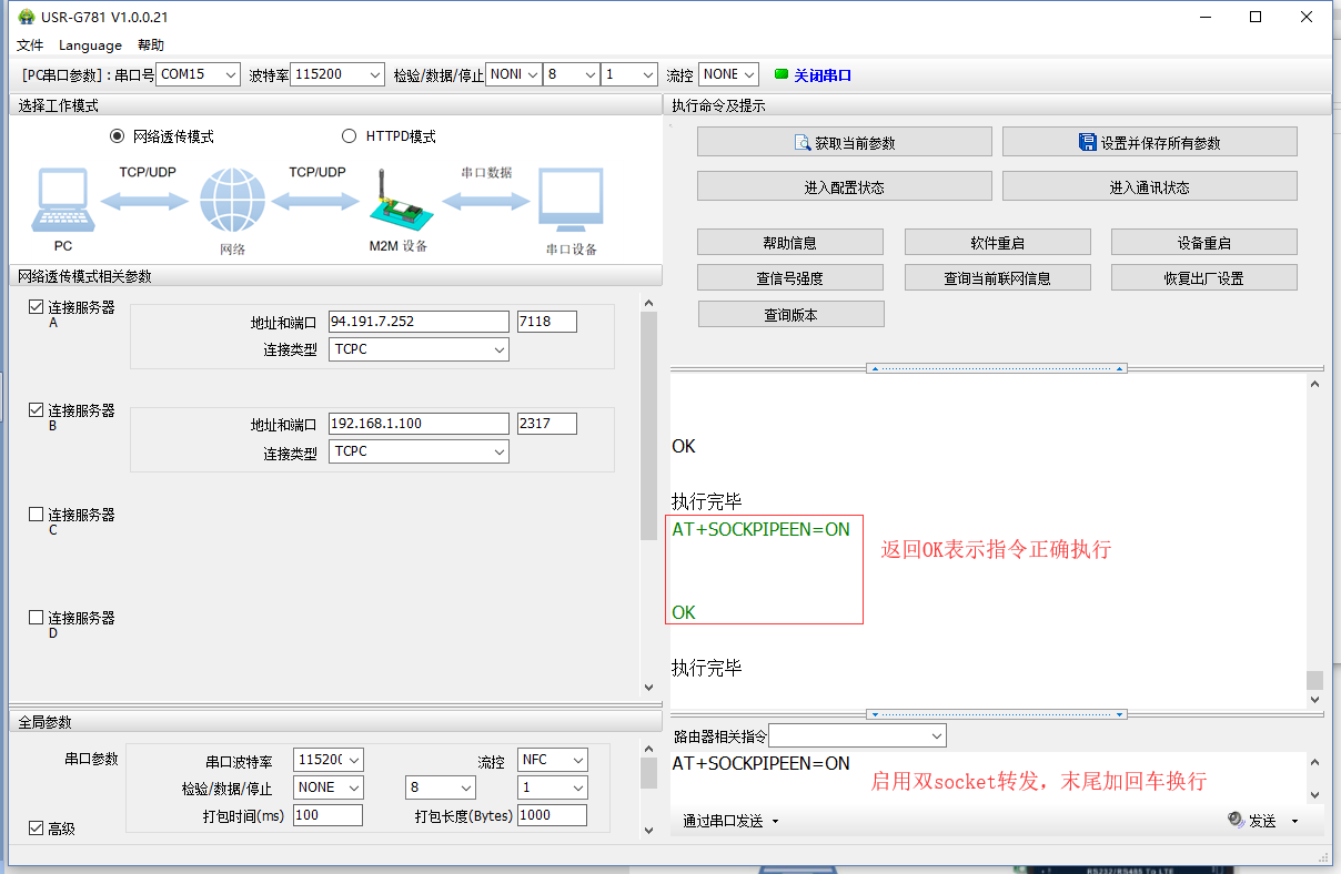 開(kāi)啟雙socket轉(zhuǎn)發(fā)功能(AT指令要以回車換行結(jié)尾)