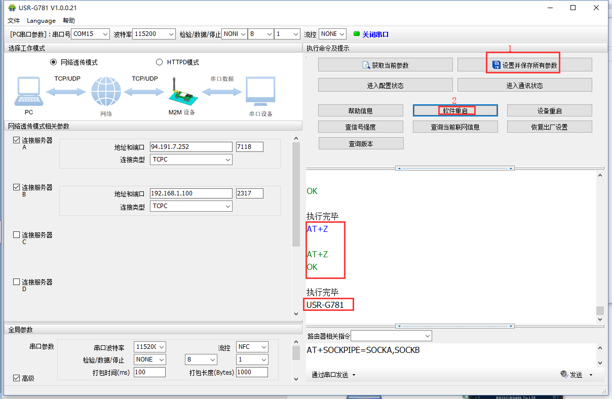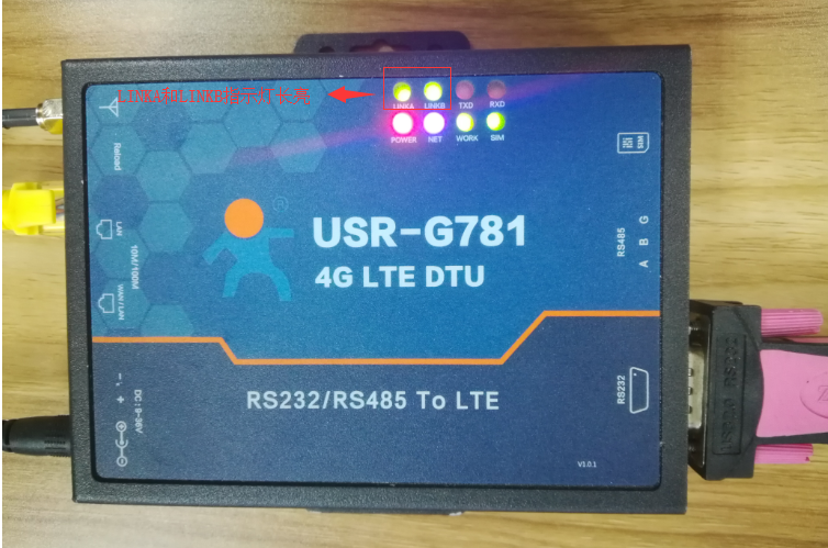 設(shè)置并保存所有參數(shù),并重啟,待串口打印啟動(dòng)信息USR-G781,表示啟動(dòng)完成,這時(shí)將電腦的端口監(jiān)聽(tīng)打開(kāi),G781的linkA和linkB指示燈會(huì)亮起來(lái),表示兩路socket成功建立并連接。