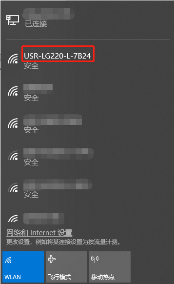 首先用PC的無線網(wǎng)卡,LG220的默認(rèn)SSID為USR-LG220-xxxx,操作電腦的無線網(wǎng)卡加入這個(gè)無線網(wǎng)絡(luò)。
