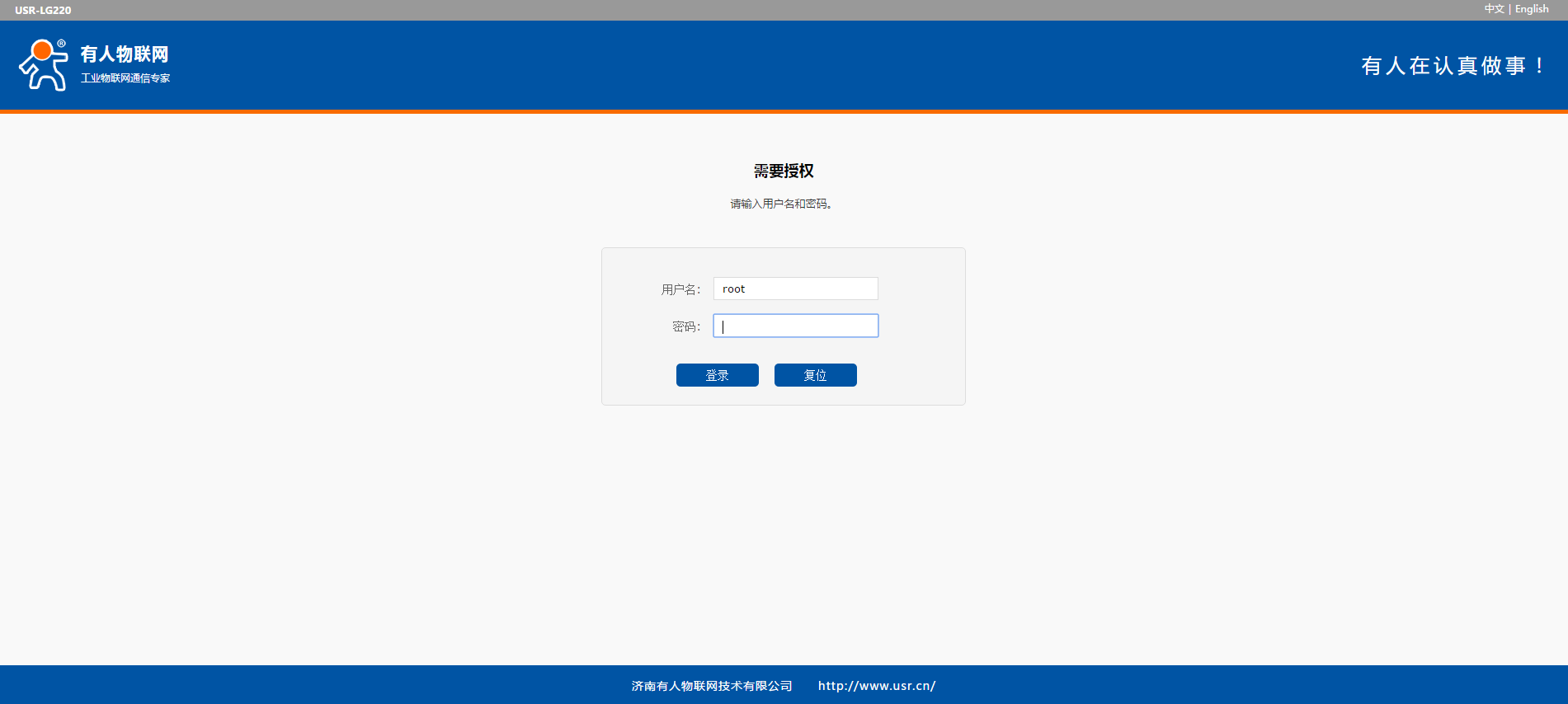 等無線連接好后,打開瀏覽器,在地址欄輸入192.168.1.1回車。填入用戶名和密碼(均為root),然后點(diǎn)擊確認(rèn)登錄,網(wǎng)頁會(huì)出現(xiàn)USR-LG220-L的管理頁面,如下圖。