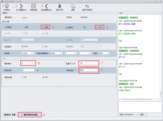 打開LoRa設(shè)置軟件(LG207和LG206-P選擇同一個),依次點擊打開串口(選擇A、B對應(yīng)的串口號,串口參數(shù):115200,None,8,1,NFC)、進入配置狀態(tài)、讀取參數(shù)、配置上表中的參數(shù)、一鍵設(shè)置所有參數(shù),關(guān)閉LoRa設(shè)置軟件。