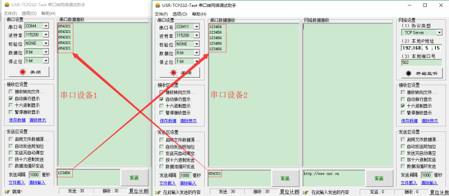 (3)啟動兩個USR-TCP232-Test(模擬串口設(shè)備1,2)分別連接LoRa數(shù)傳終端A、B的串口,使用串口設(shè)備1發(fā)送數(shù)據(jù)串口設(shè)備2可接收數(shù)據(jù)(反之亦然),通信效果如下圖所示: