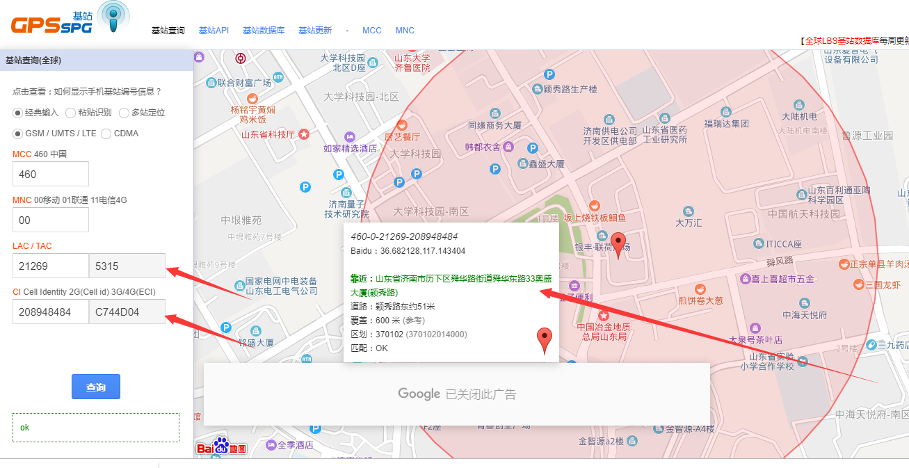 3. 打開網(wǎng)址:http://www.gpsspg.com/bs.htm,在LAC/TAC框內(nèi)鍵入5315,在下面的框內(nèi)鍵入C744D04(0C744D04開頭為0,舍棄),點(diǎn)擊查詢,即可查詢當(dāng)前模塊所在位置