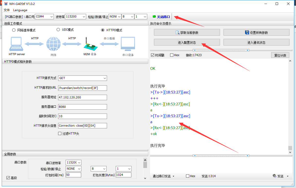 3. 是否在已經(jīng)進(jìn)入AT指令配置模式下重復(fù)點(diǎn)擊進(jìn)入配置狀態(tài)按鈕或者發(fā)送進(jìn)入配置模式的命令,點(diǎn)擊進(jìn)入通信狀態(tài)(多次間隔2秒嘗試),若能但會(huì)ok,則證明之前在AT指令配置狀態(tài)。