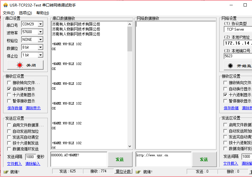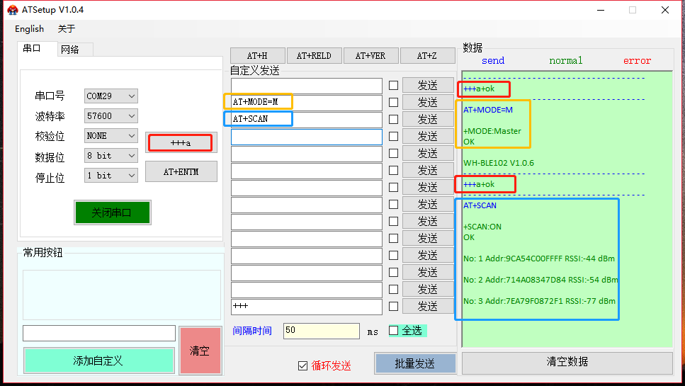 正確打開串口后,點(diǎn)擊“+++a”,接收區(qū)顯示“a+ok”說明模塊進(jìn)入了命令行模式。