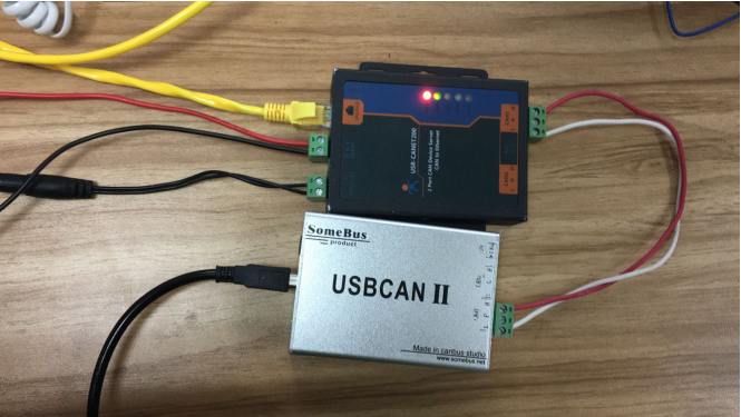 將設(shè)備USR-CANET200通過(guò)標(biāo)準(zhǔn)的適配器電源將設(shè)備上電,網(wǎng)線直連電腦。通過(guò)485轉(zhuǎn)USB串口線將塞設(shè)備的485串口和電腦相連接,然后通過(guò)Can轉(zhuǎn)USB串口線,將設(shè)備同電腦進(jìn)行鏈接。