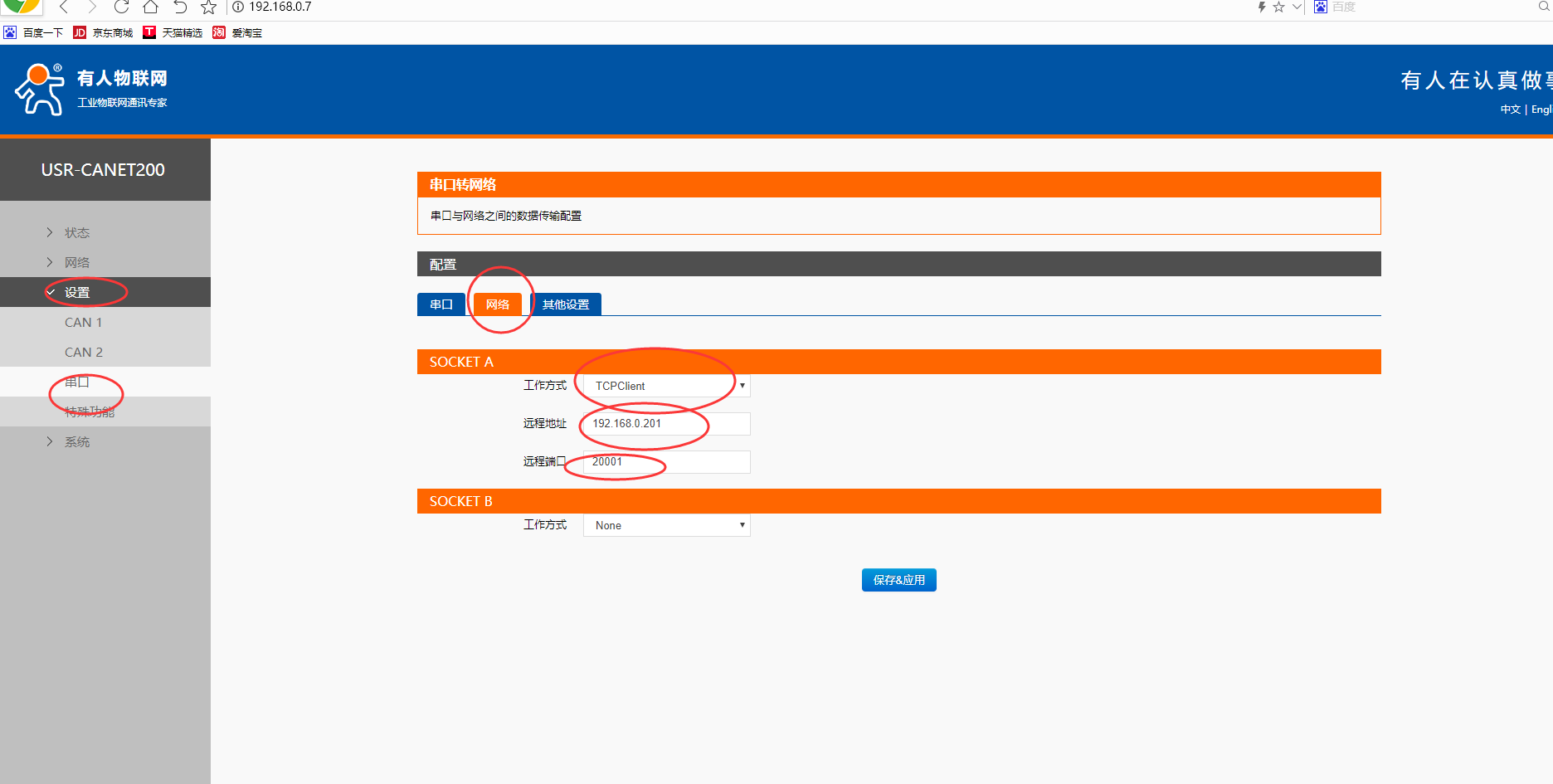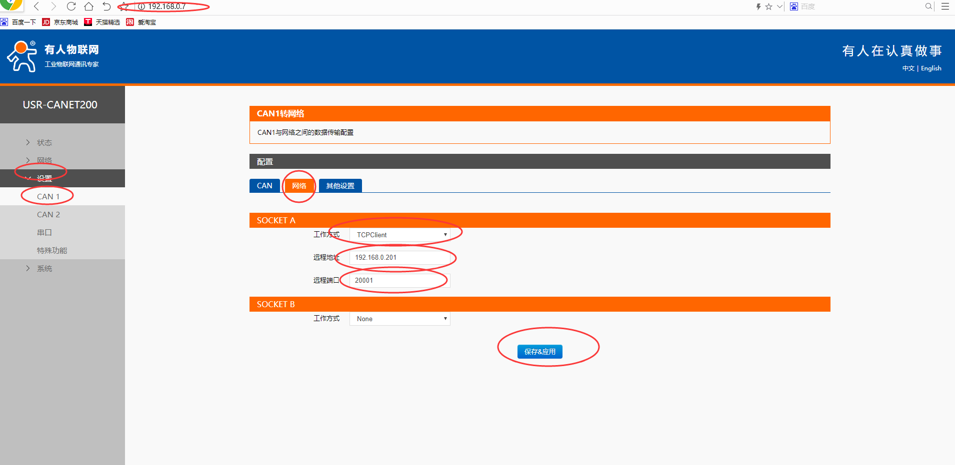 2. 設(shè)置Canet200相關(guān)的參數(shù):(可以通過(guò)設(shè)置軟件和內(nèi)置網(wǎng)頁(yè)兩者均可,以下通過(guò)內(nèi)置網(wǎng)頁(yè)進(jìn)行):打開(kāi)瀏覽器,輸入設(shè)備默認(rèn)的IP地址:192.168.0.7 輸入賬號(hào)和密碼(均為admin),點(diǎn)擊設(shè)置面的Can1口(以1口為例),點(diǎn)擊網(wǎng)絡(luò)參數(shù),設(shè)置工作方式為“TCP Client”,然后遠(yuǎn)程IP地址為:192.168.0.201(這是直連電腦的IP地址),端口號(hào)為“20001”設(shè)置完成后點(diǎn)擊保存。