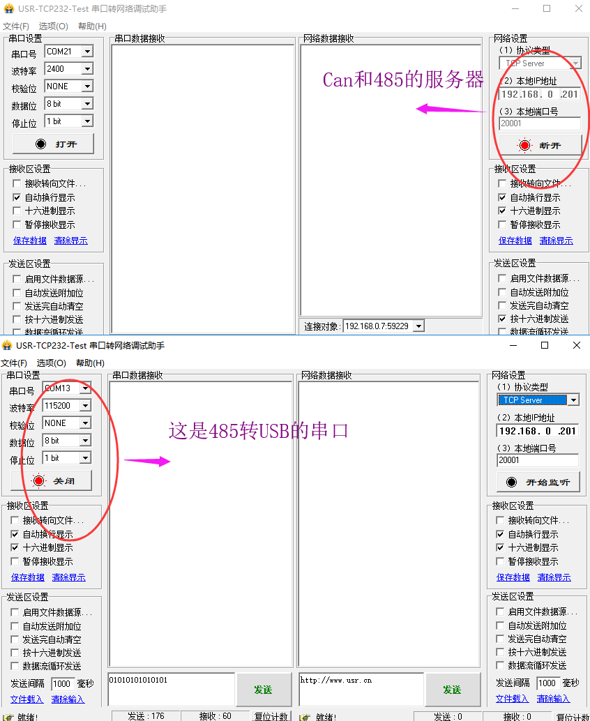 5. 然后打開(kāi)兩個(gè)測(cè)試軟件:USR-TCP232-Test-V1.3(一個(gè)是作為485串口接收端,一個(gè)作為Can和485的服務(wù)器),參數(shù)如圖所示: