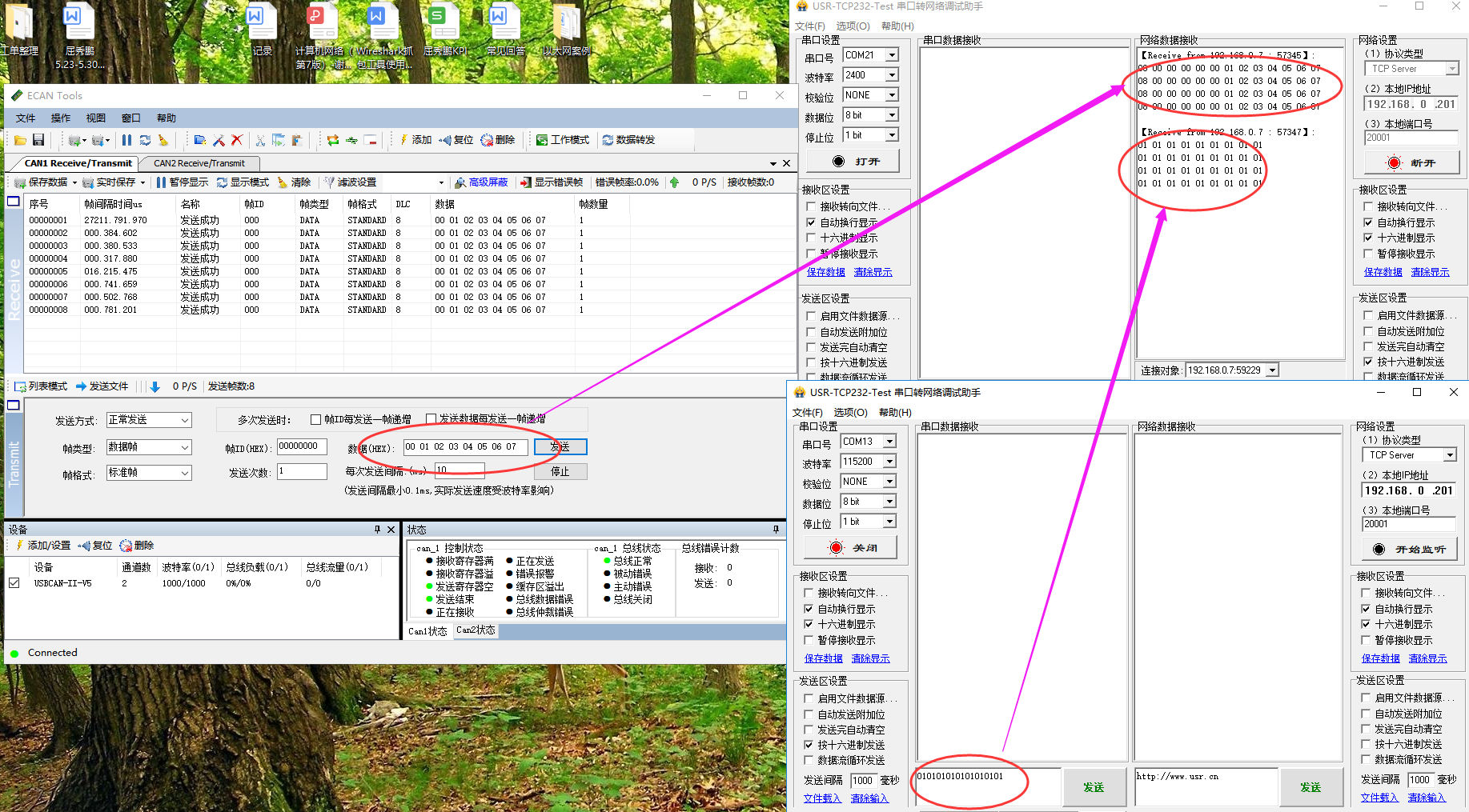 6. 然后通過(guò)Can工具,和485的串口向服務(wù)器發(fā)送數(shù)據(jù),如圖所示: