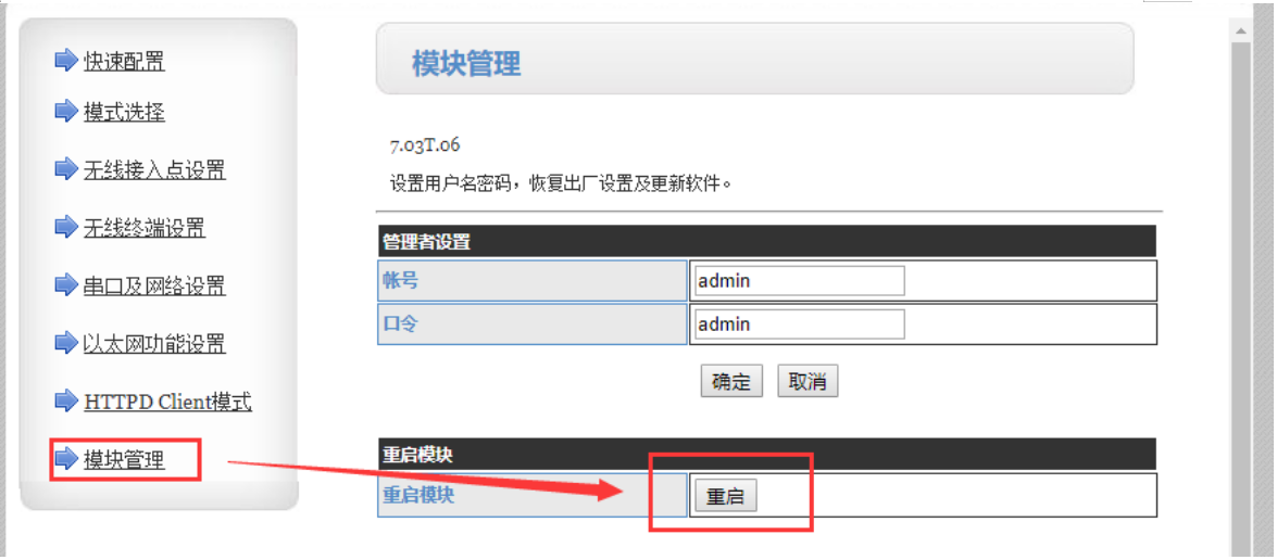 f.進(jìn)入模塊管理頁(yè)面點(diǎn)擊重啟,重啟使改動(dòng)生效,此時(shí)對(duì)客戶端的設(shè)置完成