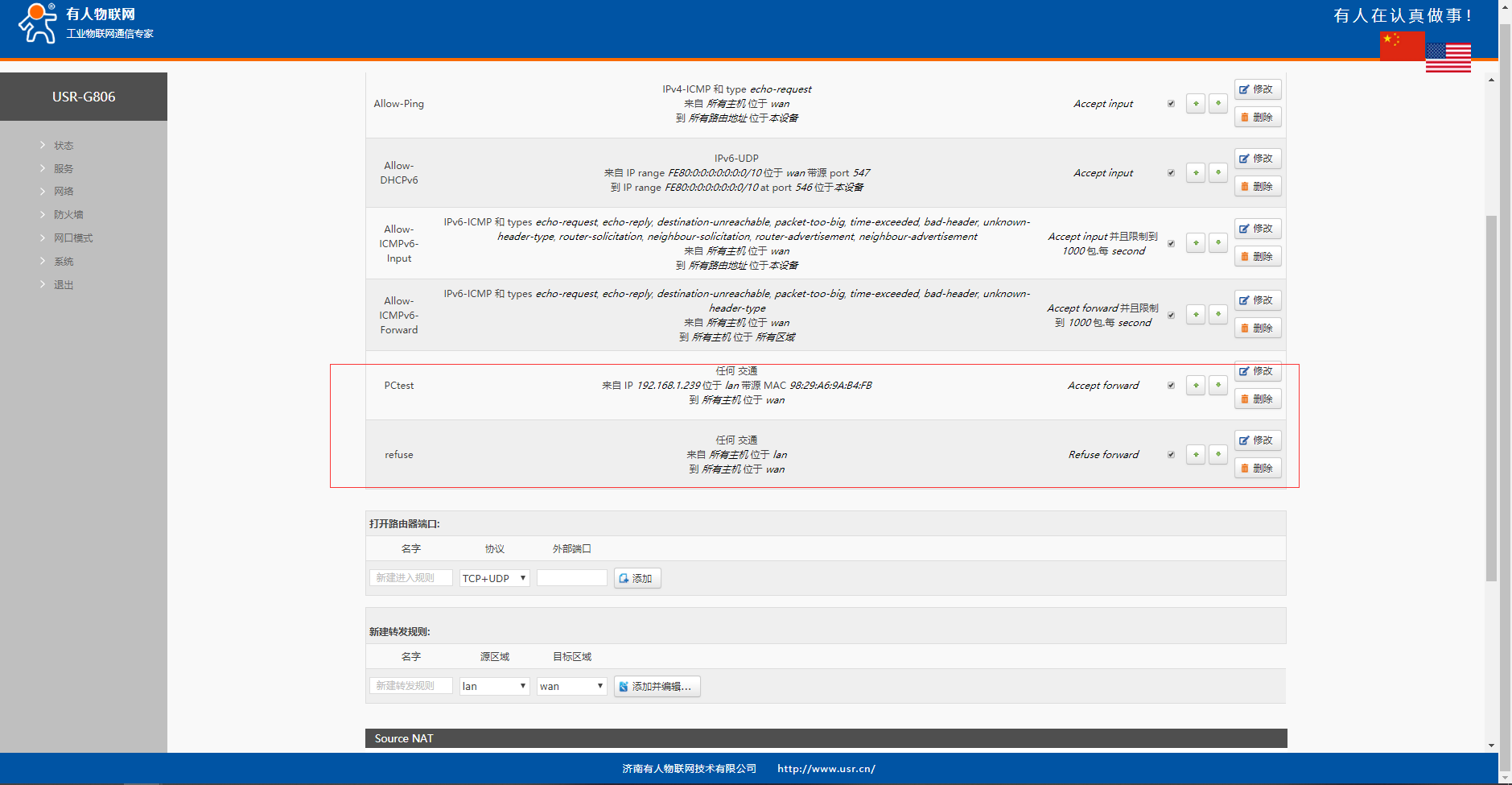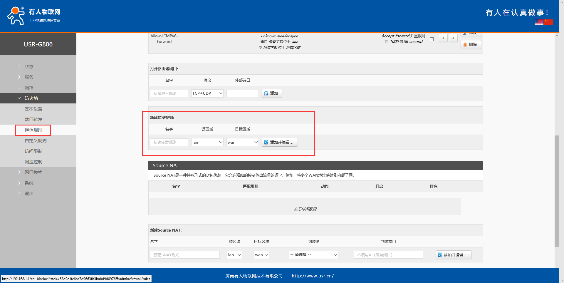 4、進(jìn)入防火墻----通信規(guī)則界面,新建轉(zhuǎn)發(fā)規(guī)則,自定義轉(zhuǎn)發(fā)名稱,選擇源區(qū)域和目的區(qū)域后點(diǎn)擊添加并編輯。