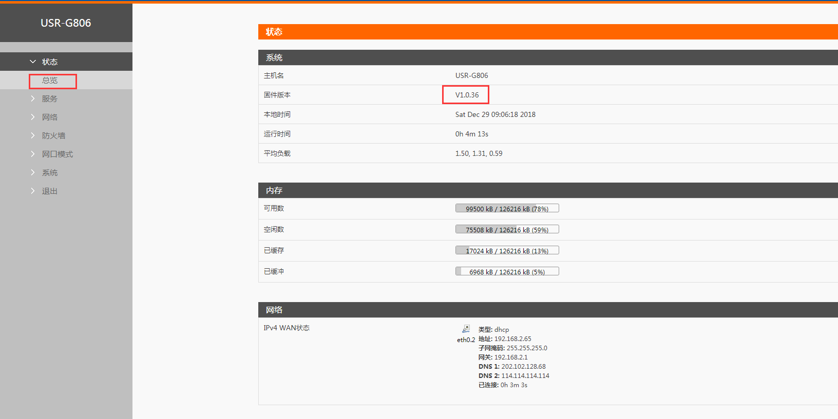 2、 在狀態(tài)-->總覽里邊可以看到固件版本號V1.0.36,現(xiàn)在升級到V1.0.38版本。