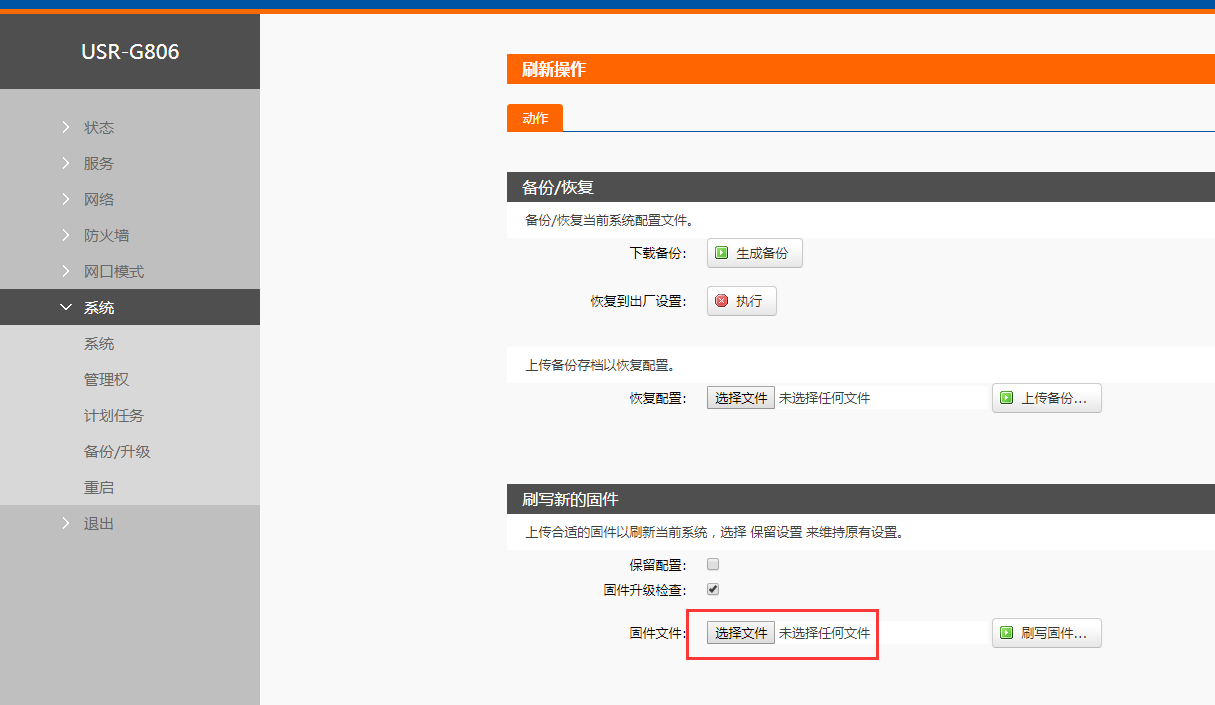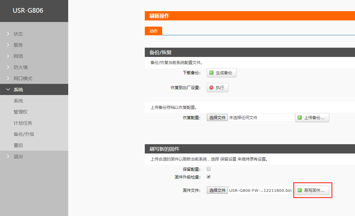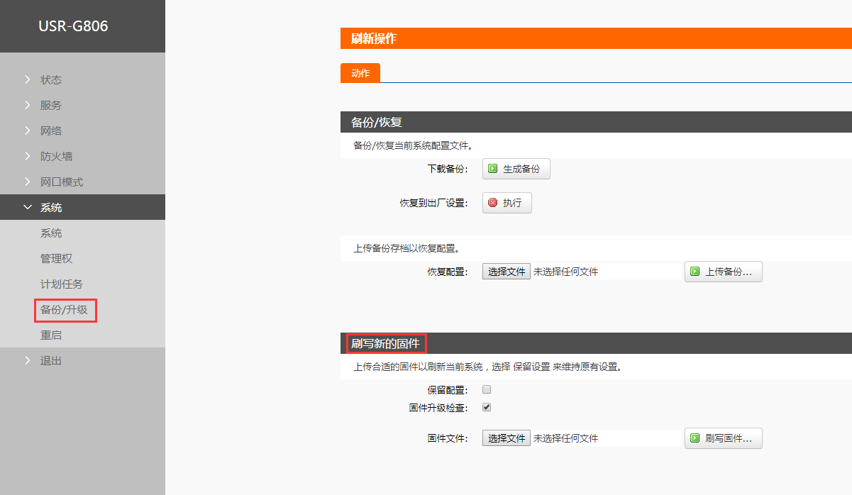 3、在系統(tǒng)中選擇備份/升級選項(xiàng),可以看到有刷寫新的固件的選項(xiàng)卡。