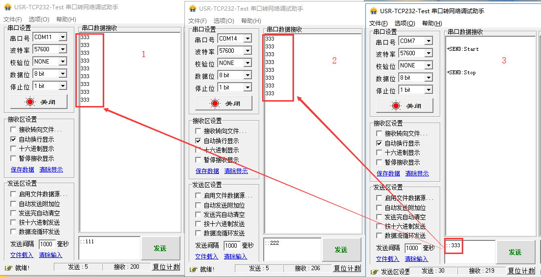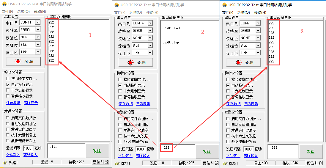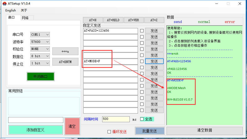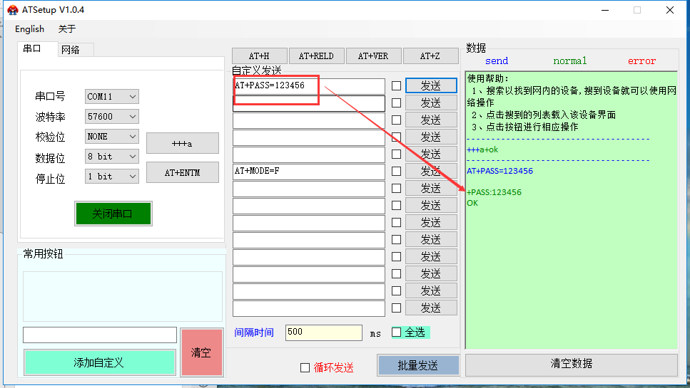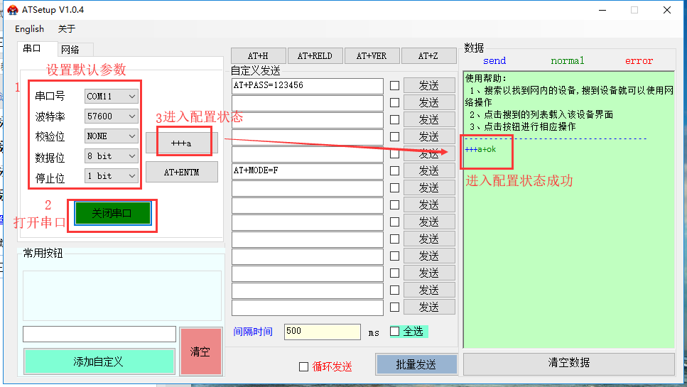 1、打開AT指令設(shè)置軟件,依次點(diǎn)擊打開串口(選擇A、B、C對(duì)應(yīng)的串口號(hào),串口參數(shù):57600,None,8,1,)、進(jìn)入配置狀態(tài)、發(fā)送AT指令進(jìn)行配置。
