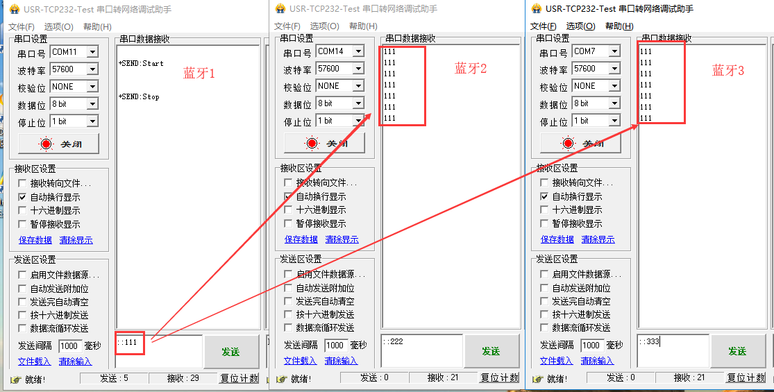 由于組網(wǎng)的原理所以導(dǎo)致每次發(fā)送的數(shù)量不大于 20 字節(jié),并且傳輸過程中會(huì)有一定時(shí)間的延遲(根據(jù)信號(hào) 強(qiáng)度等決定),并且不能確保數(shù)據(jù)準(zhǔn)確的送達(dá),請(qǐng)根據(jù)實(shí)際應(yīng)用環(huán)境進(jìn)行調(diào)整。注意:在每次發(fā)送數(shù)據(jù)前請(qǐng)加 兩個(gè)::(兩個(gè)冒號(hào)),例如要發(fā)送的數(shù)據(jù)為111,則實(shí)際需要輸入的為::111