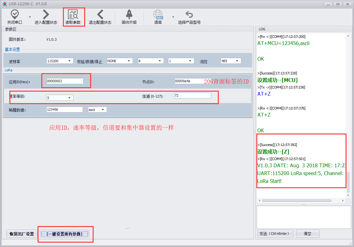 2、點擊讀取參數(shù),設(shè)置參數(shù),保證應(yīng)用ID(可設(shè)),速率等級,信道要和集中器一樣,節(jié)點ID在206背面的標簽上。設(shè)置完成后一定不要忘一鍵設(shè)置所有參數(shù)。