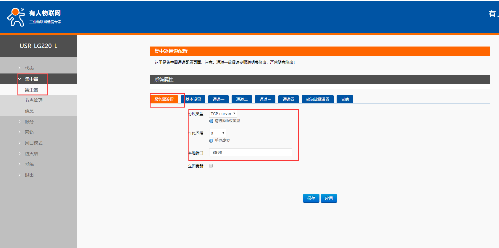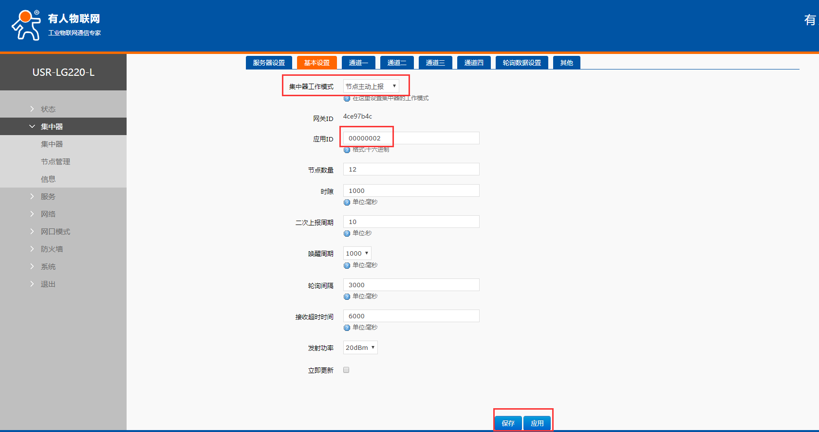 6、設(shè)置集中器的應(yīng)用ID,依次點擊集中器,基本設(shè)置,應(yīng)用ID(206設(shè)置的應(yīng)用ID),設(shè)置應(yīng)用ID和lora相同。最后保存應(yīng)用。工作模式以節(jié)點主動上報為例。
