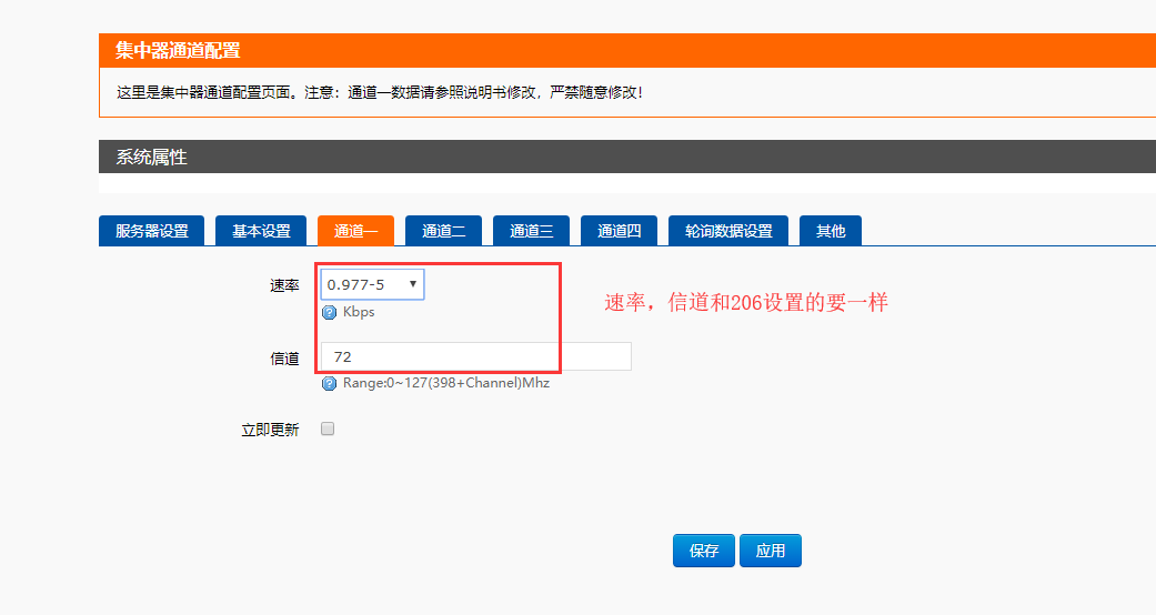 7、設(shè)置集中器的信道和速率,依次點擊集中器,通道一設(shè)置速率和信道和lora相同,點擊保存應(yīng)用,通道二、三、四中設(shè)置的速率與信道各不相同,且都與通道一不同。