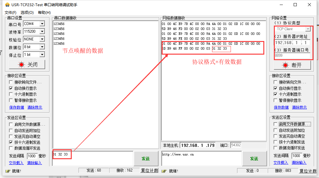 節(jié)點模塊串口接小黃人串口網(wǎng)絡(luò)調(diào)試助手,正確打開串口, 節(jié)點會接收到喚醒數(shù)據(jù),節(jié)點上報數(shù)據(jù)后,集中器根據(jù)協(xié)議格式向服務(wù)器上報數(shù)據(jù),協(xié)議內(nèi)容可閱讀集中器說明書23頁了解詳情。
