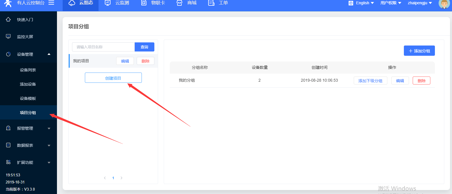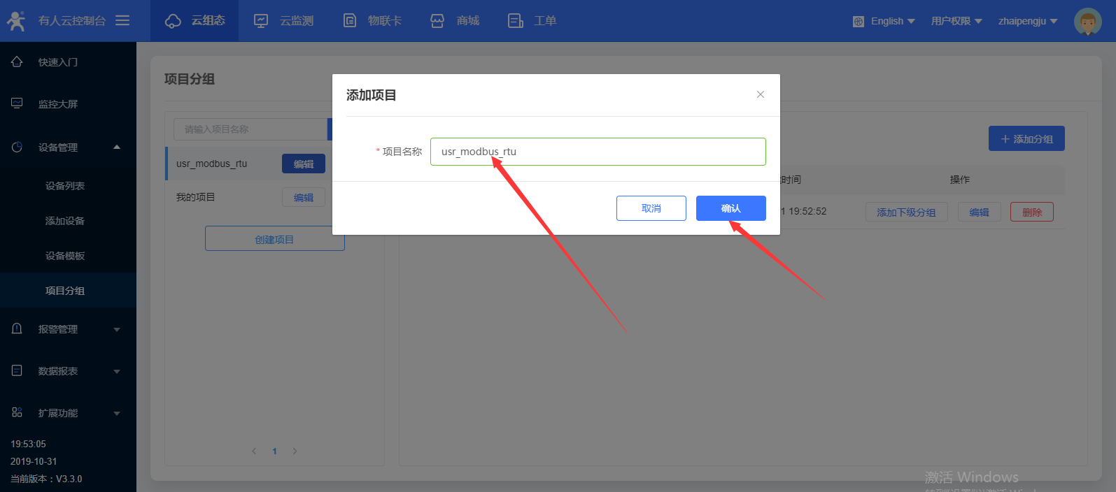 1. 首先在有人云平臺(tái)創(chuàng)建一個(gè)項(xiàng)目分組,如圖1(1),名稱這里命名為usr_modbus_rtu,如圖1(2),點(diǎn)擊確定完成項(xiàng)目創(chuàng)建。