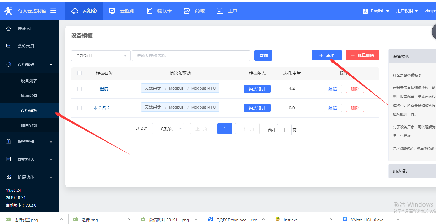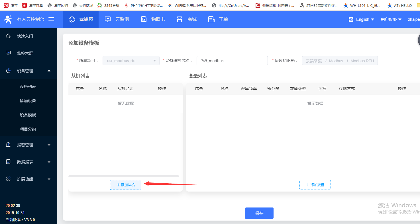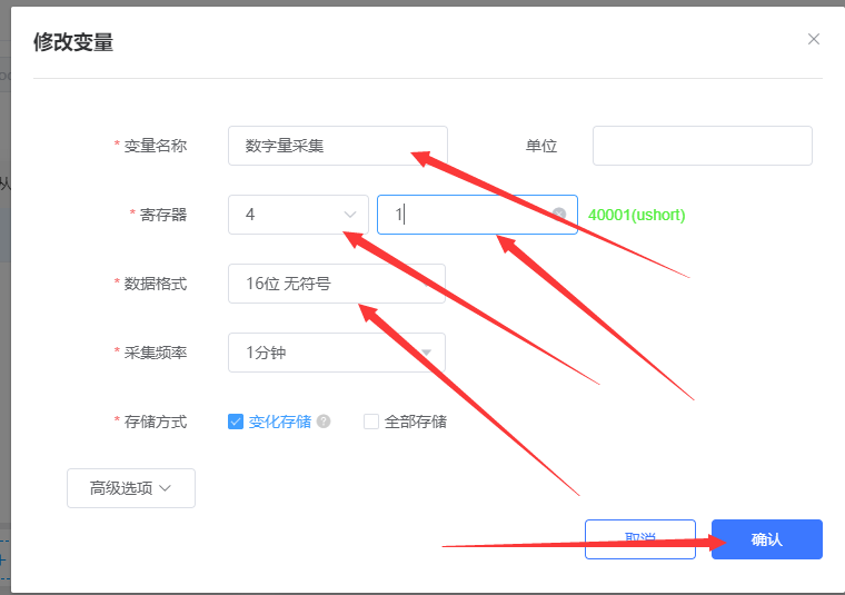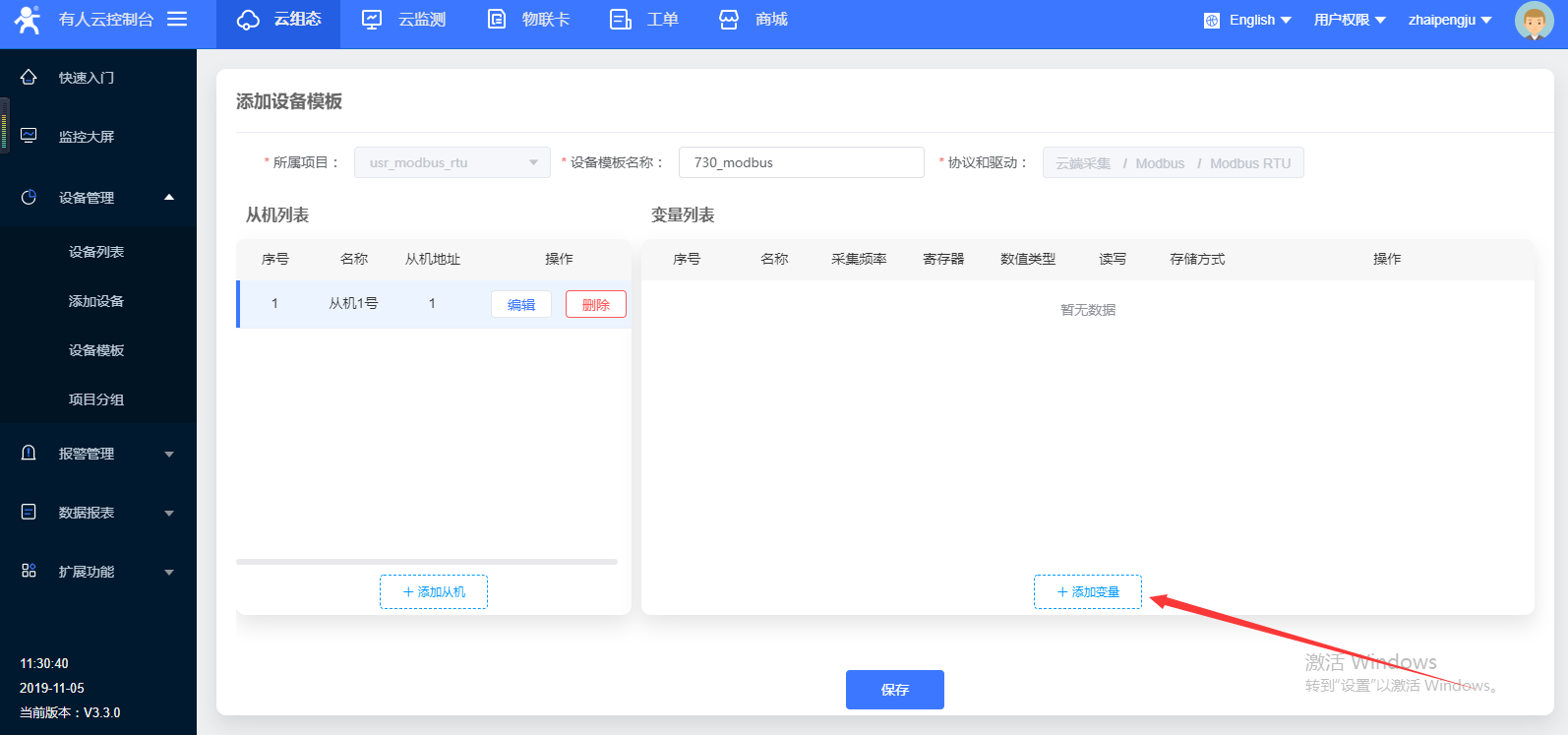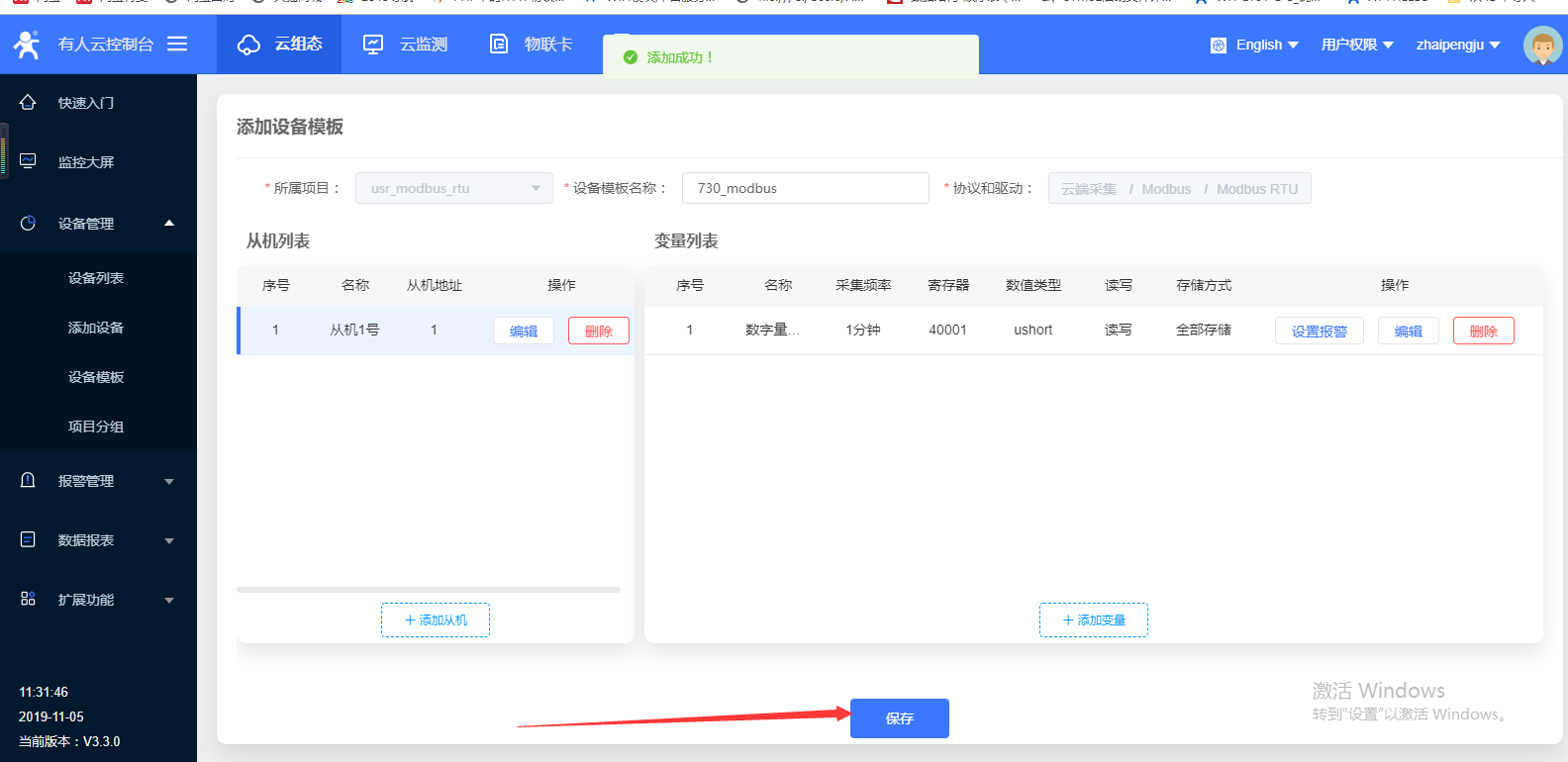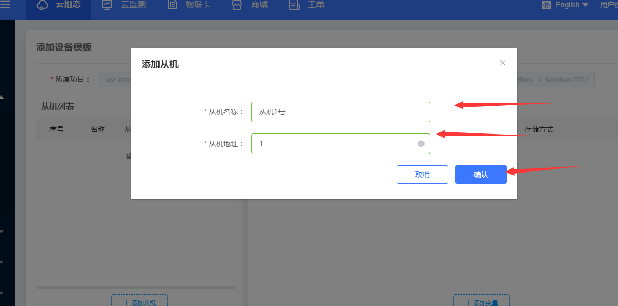 2. 點(diǎn)擊設(shè)備模板,然后點(diǎn)擊添加,開(kāi)始添加設(shè)備模板。如圖2(1);在打開(kāi)的頁(yè)面中所屬項(xiàng)目選擇剛才創(chuàng)建的項(xiàng)目,設(shè)備模板名稱這里命名為730_modbus,協(xié)議和驅(qū)動(dòng)一欄選擇云端采集——modbus rtu,點(diǎn)擊下一步,配置從機(jī)和變量如圖2(2);點(diǎn)擊添加從機(jī)如圖2(3);這里從機(jī)名稱命名為從機(jī)1號(hào),從機(jī)地址填寫(xiě)為1,然后點(diǎn)擊確定,這里的從機(jī)地址就是modbus協(xié)議中的從機(jī)設(shè)備號(hào)如圖2(4);點(diǎn)擊添加變量如圖2(5);這里為變量命名為數(shù)字量采集,寄存器類型選擇為4(關(guān)于寄存器類型選擇參看步驟2結(jié)尾說(shuō)明部分),數(shù)據(jù)格式選擇16位無(wú)符號(hào),采集頻率設(shè)置為一分鐘,如圖2(6);最后點(diǎn)擊保存如圖2(7)。