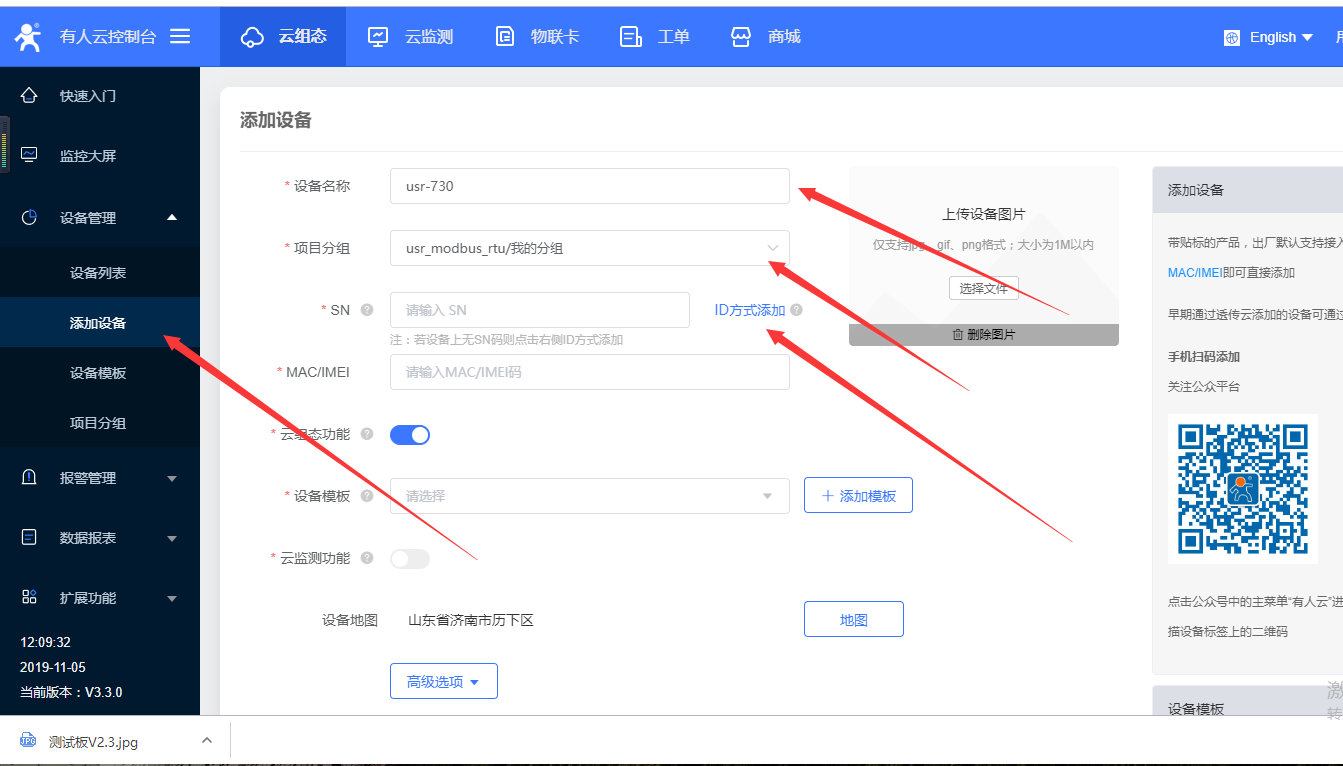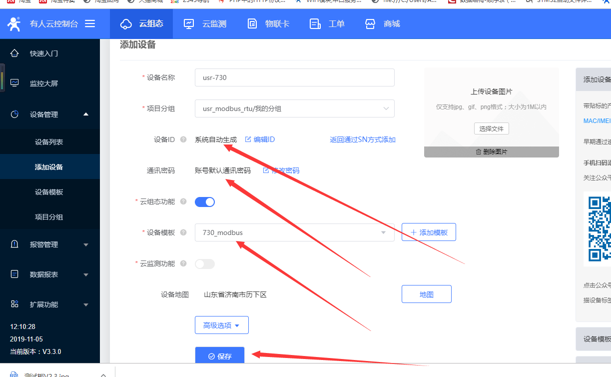 3. 點(diǎn)擊添加設(shè)備,設(shè)備名稱選擇為GPRS DTU usr-730,項(xiàng)目分組選擇為usr_modbus_rtu/我的分組,選擇ID方式添加如圖3(1),設(shè)備ID和密碼默認(rèn)即可,設(shè)備模板選擇我們剛才創(chuàng)建的模板,點(diǎn)擊保存如圖3(2)。