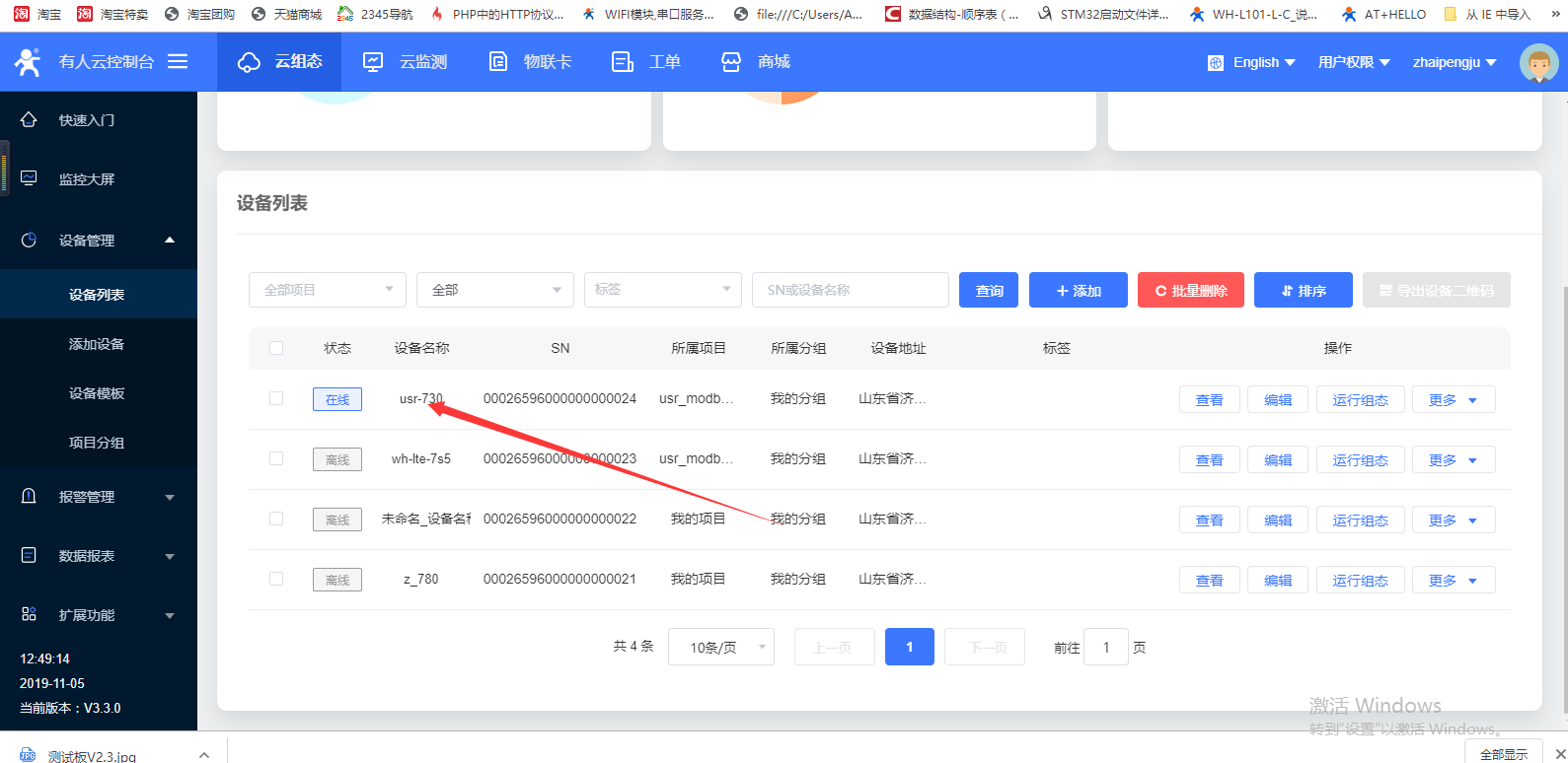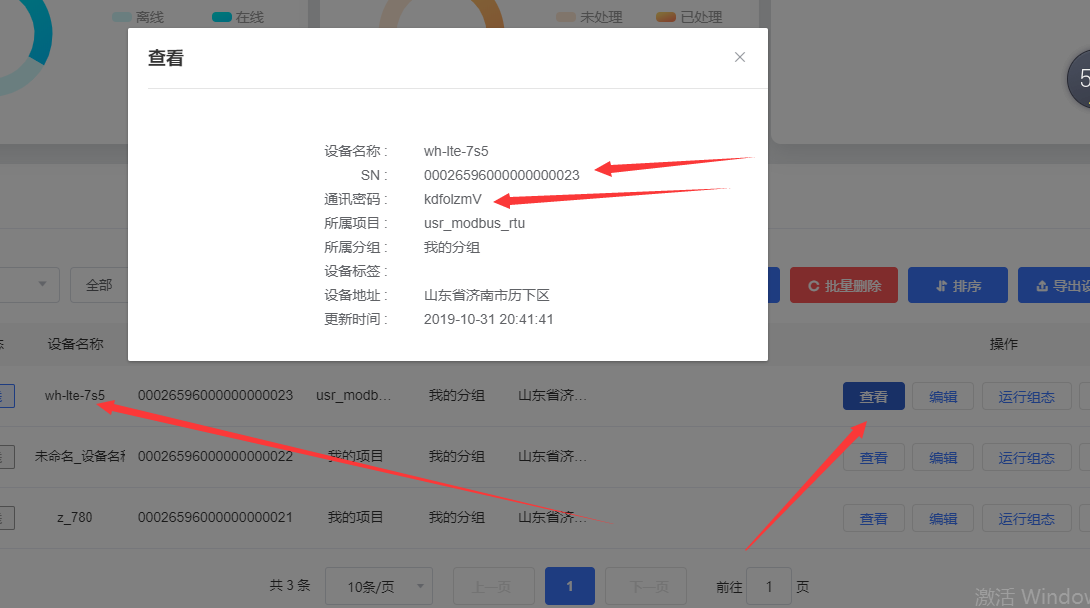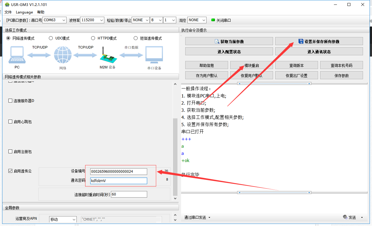 4. 打開(kāi) 730 的配置軟件,電腦串口連接 730,點(diǎn)擊打開(kāi)串口,勾選連接服務(wù)器 A,地址填寫(xiě) clouddata.usr.cn,端口 15000,勾選啟用透?jìng)髟?/span>,設(shè)備號(hào)與密碼填寫(xiě)圖 4(2) 中的設(shè)備號(hào)與密碼,填寫(xiě)完成后選擇進(jìn)入配置狀態(tài),待 730 串口返回 ok 之后,點(diǎn)擊設(shè)置并保存所有參數(shù),待所有參數(shù)配置完成之后,點(diǎn)擊模塊重啟,使參數(shù)生效。如圖 4(1),此時(shí)我們可以看到透?jìng)髟贫说脑O(shè)備已經(jīng)上線了,如圖 4(3)。