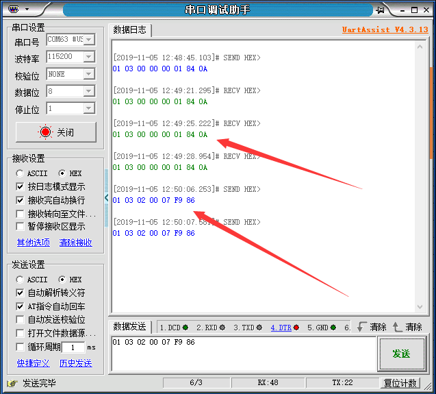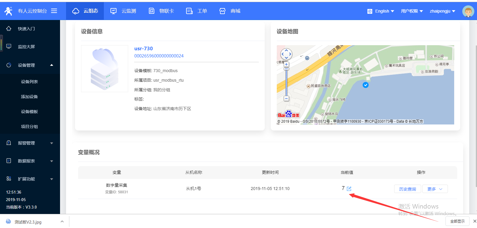 5. 打開(kāi)配置軟件,將接收調(diào)整為16進(jìn)制接收,可以看到有人云下發(fā)的指令:01 03 00 00 00 01 84 0A,這時(shí)候我們根據(jù)modbus協(xié)議上傳一組數(shù)據(jù):01 03 02 00 07 F9 86 ,如圖5(1)。點(diǎn)擊設(shè)備,來(lái)到如圖5(2)界面用來(lái)查看數(shù)據(jù),我們可以看到當(dāng)前數(shù)值變?yōu)?如圖5(3)。