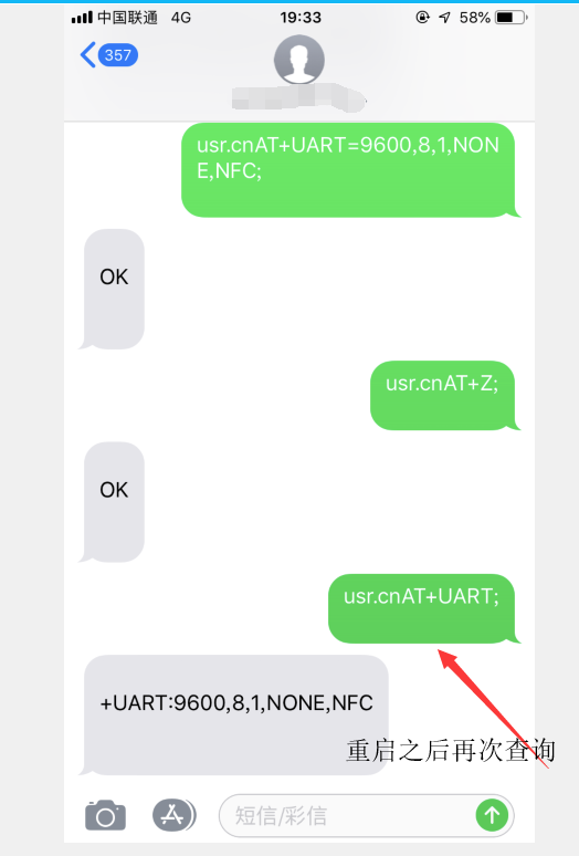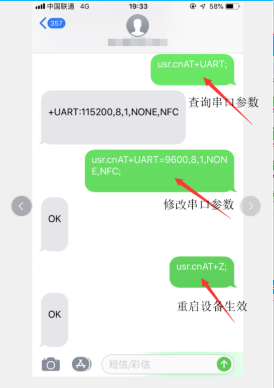 2.通過手機(jī)發(fā)送固定格式的短信給DTU內(nèi)的手機(jī)號。短信AT指令格式:命令密碼+AT指令,命令密碼出廠默認(rèn)是usr.cn。注意:AT指令后面要加英文分號和回車換行,本例以修改DR504的串口參數(shù)為例。如圖2所示