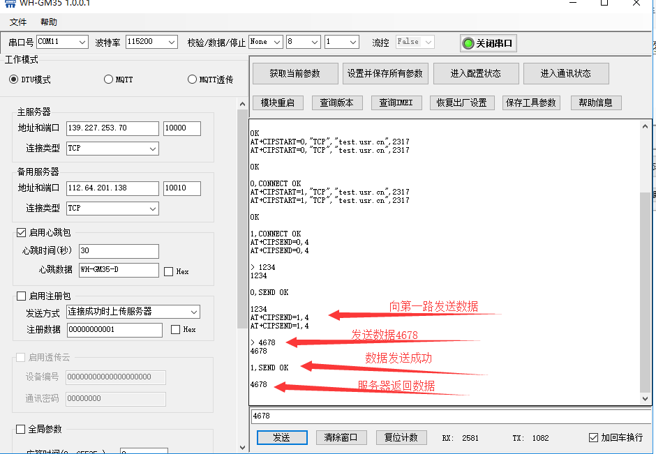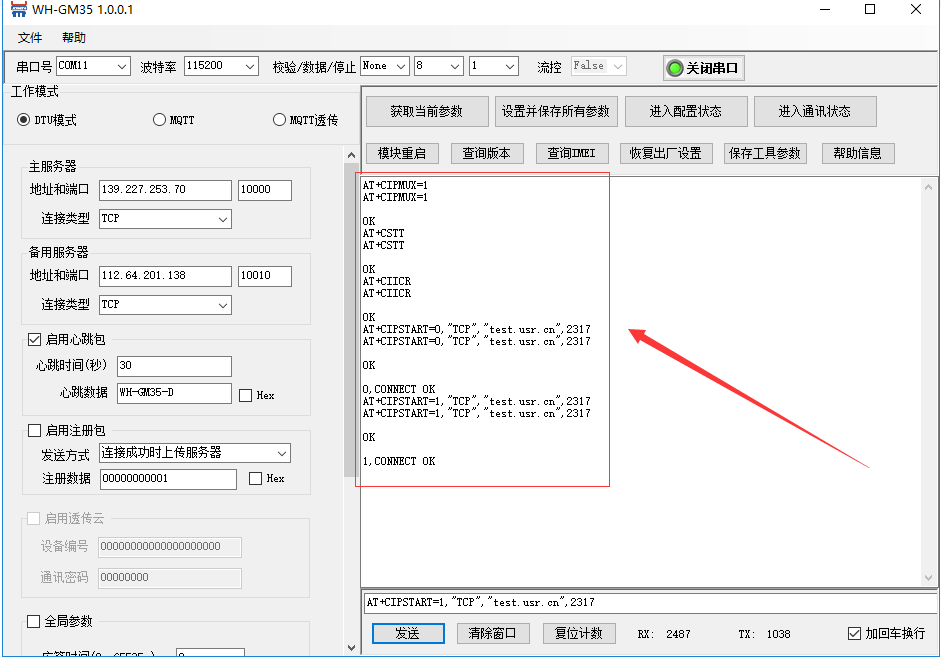 AT+CIPSTART=0,"TCP","test.usr.cn",2317 建立第一路 TCP 連接