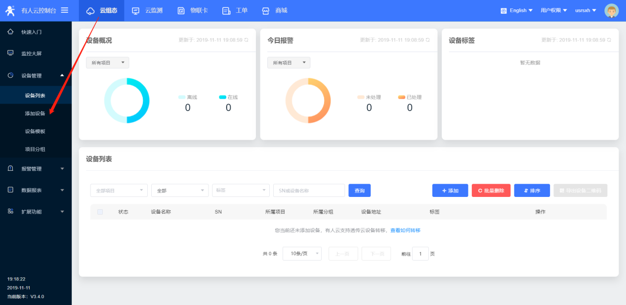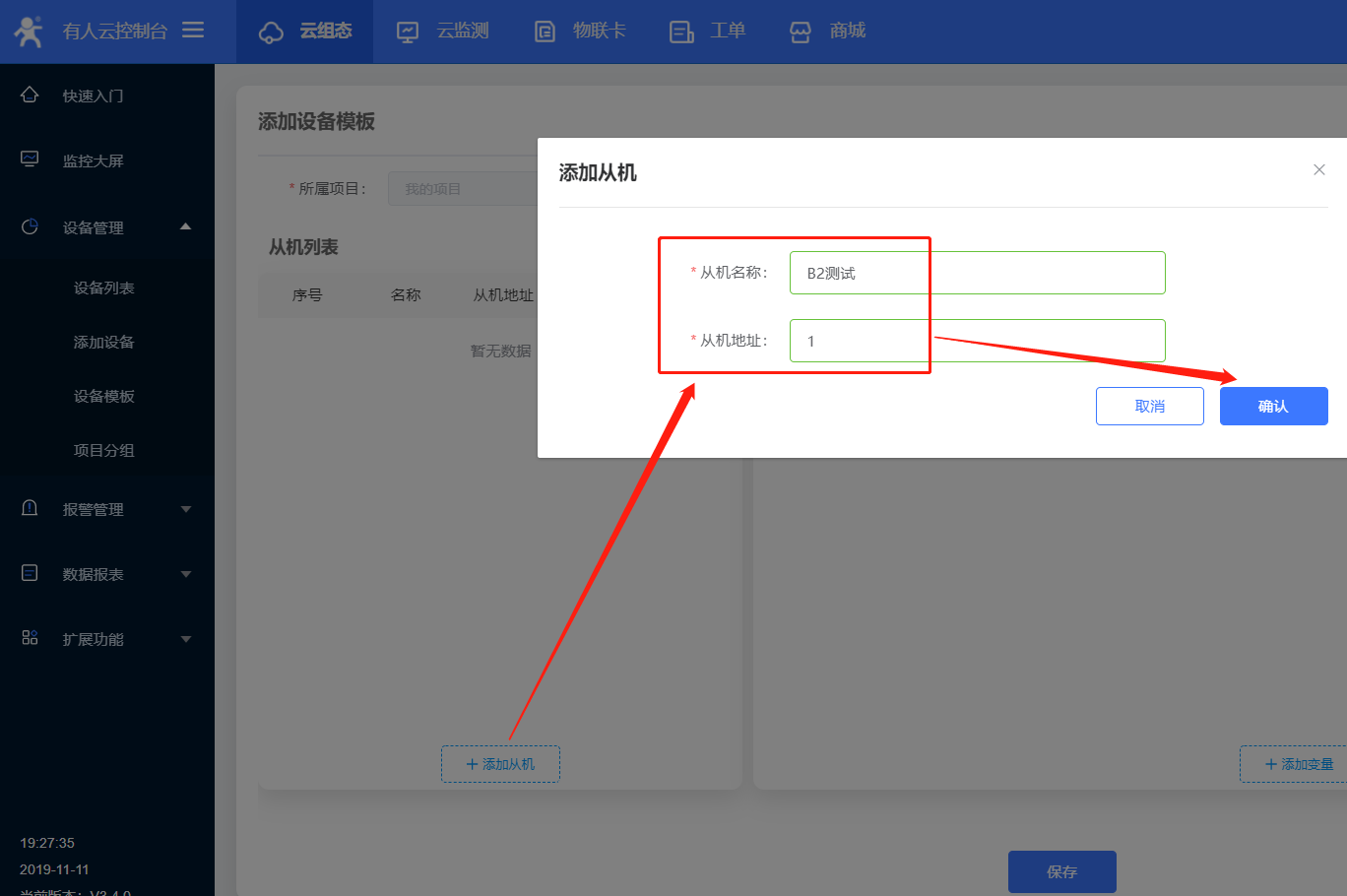 5、本次案例是A2/B2連有人云進(jìn)行數(shù)據(jù)顯示,可以進(jìn)入云組態(tài),選擇添加設(shè)備;