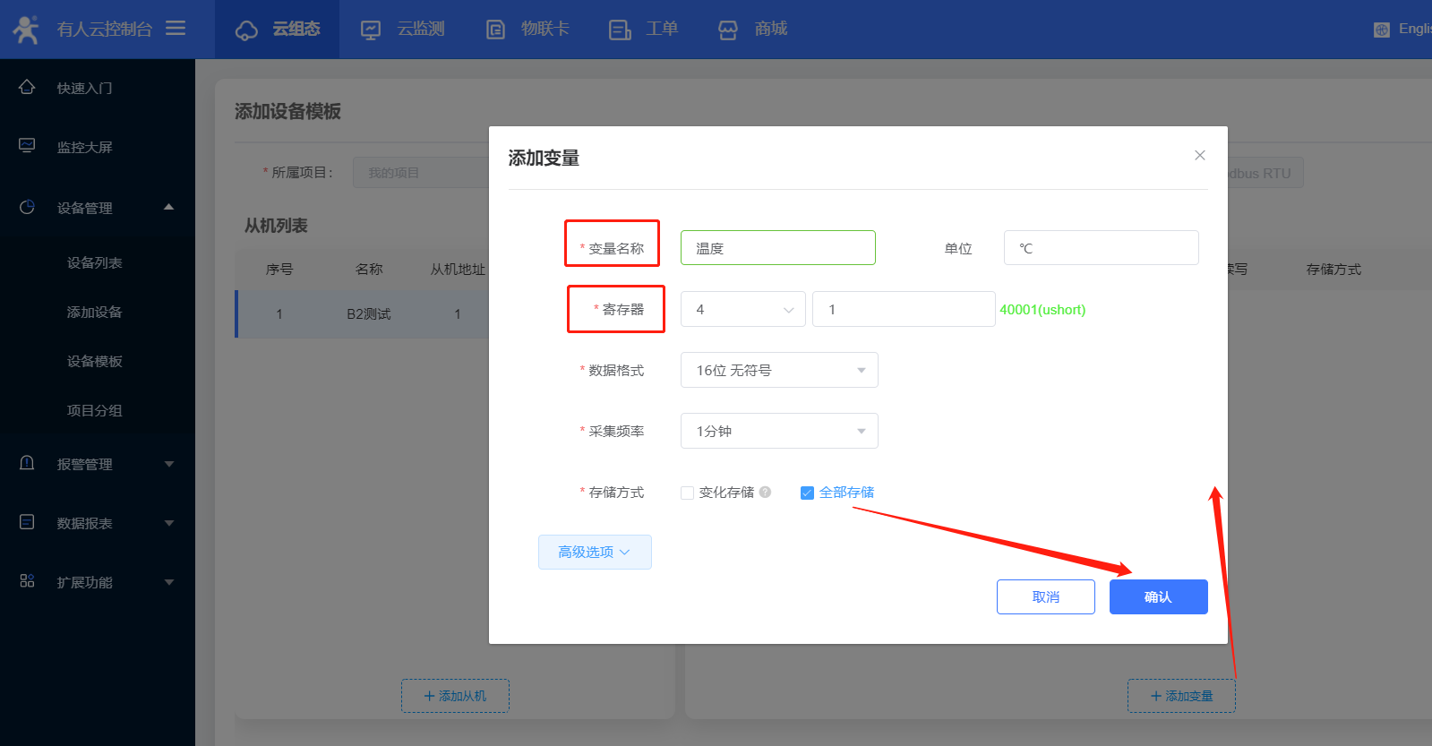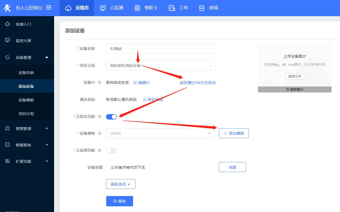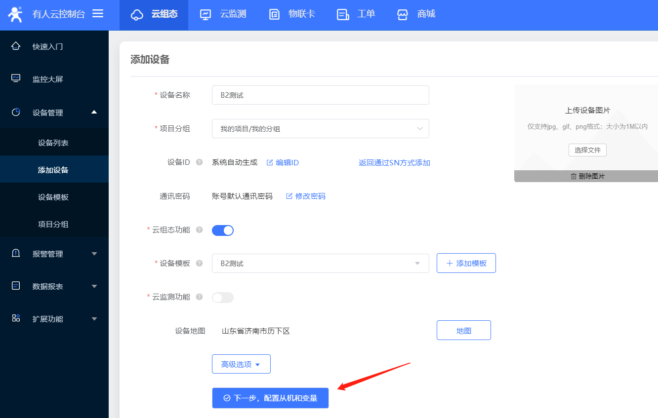 6、設(shè)置設(shè)備名稱,和項(xiàng)目分組,A2/B2目前只能使用ID方式添加設(shè)備id;設(shè)備id和密碼設(shè)置默認(rèn)就可以,選擇云組態(tài),添加數(shù)據(jù)模板;