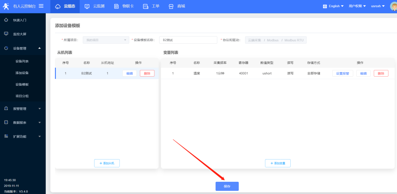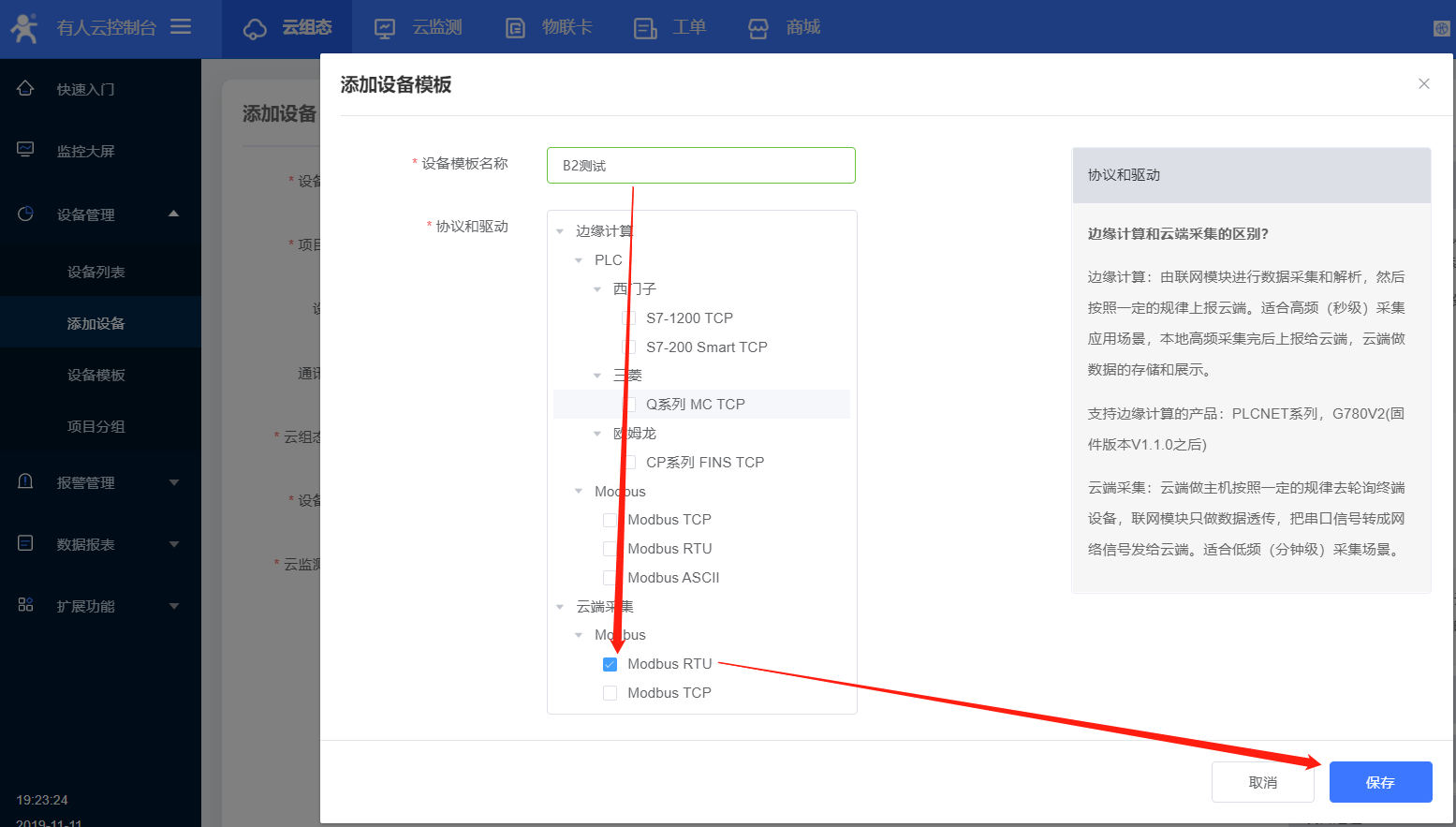 7、模板更改名稱,選擇modbus rtu協(xié)議,點(diǎn)擊保存