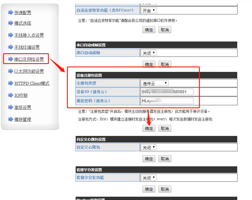 14、進(jìn)入到串口及網(wǎng)絡(luò)參數(shù)設(shè)置,串口參數(shù)設(shè)置為和您終端設(shè)備的串口參數(shù)一致。注冊(cè)包選擇透?jìng)髟疲钌贤競(jìng)髟粕闲陆⒌脑O(shè)備id,和密碼(如下圖所示),點(diǎn)擊保存