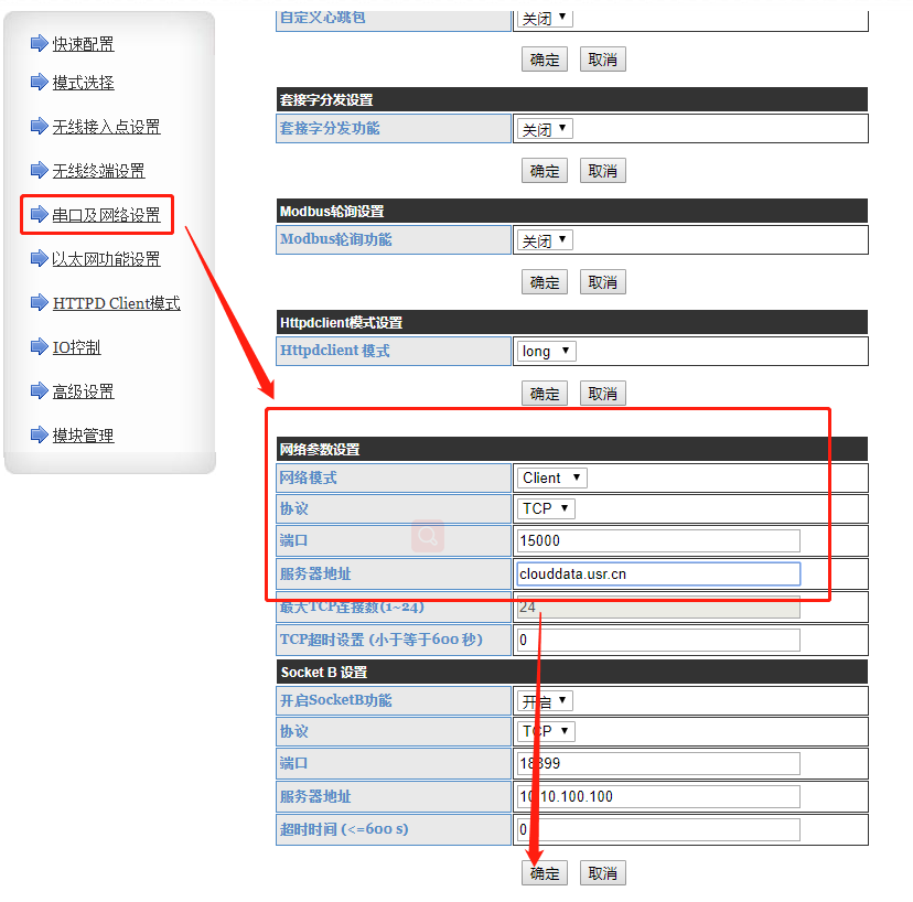 15、在串口及網(wǎng)絡(luò)參數(shù)中的網(wǎng)絡(luò)設(shè)置上設(shè)置為Tcp Client,透?jìng)髟频挠蛎麨?/span>clouddata.usr.cn,透?jìng)髟频亩丝跒?/span>15000,設(shè)置完點(diǎn)擊保存;