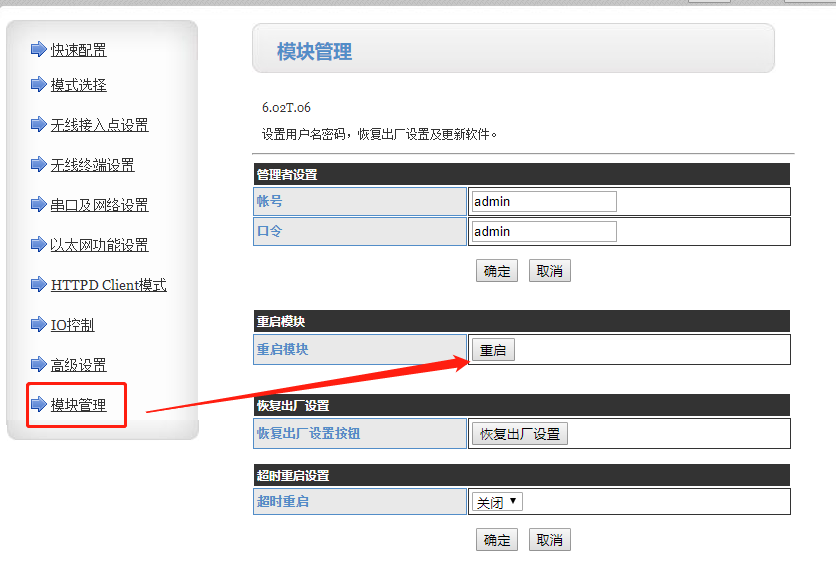 內(nèi)置網(wǎng)頁(yè)的賬號(hào)和密碼都是admin,進(jìn)入以后選擇模式選擇模式選擇為sta模式,點(diǎn)擊確定;(先不要重啟,等設(shè)置完所有的參數(shù)再重啟設(shè)備)