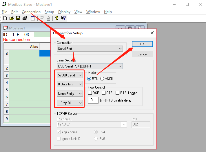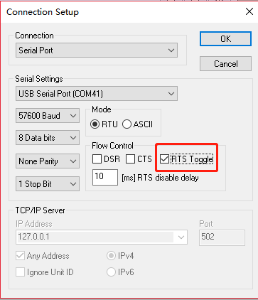 18、打開(kāi)modbus軟件,點(diǎn)擊連接。選擇串口com41(B2的串口用usb轉(zhuǎn)232接到電腦上的),串口參數(shù)要和B2一致。