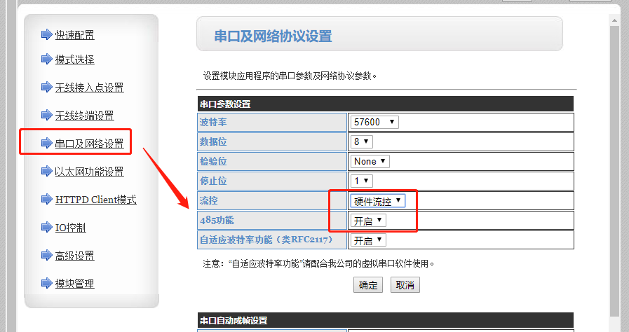 注:若是B2連接485串口線,使用485串口線時(shí), 需要現(xiàn)將模塊的打開(kāi)485功能,可在內(nèi)置網(wǎng)頁(yè)或AT指令配置AT+FUDLX開(kāi)啟485功能,該命令使能或禁止 485 控制功能,默認(rèn) RS485 是關(guān)閉的,485 控制引腳為 RTS。該命令設(shè)置后恢復(fù)出廠設(shè) 置生效。 AT+UART配置硬件流控,重啟生效,指令詳情可看產(chǎn)品軟件設(shè)計(jì)手冊(cè)AT指令詳情部分。