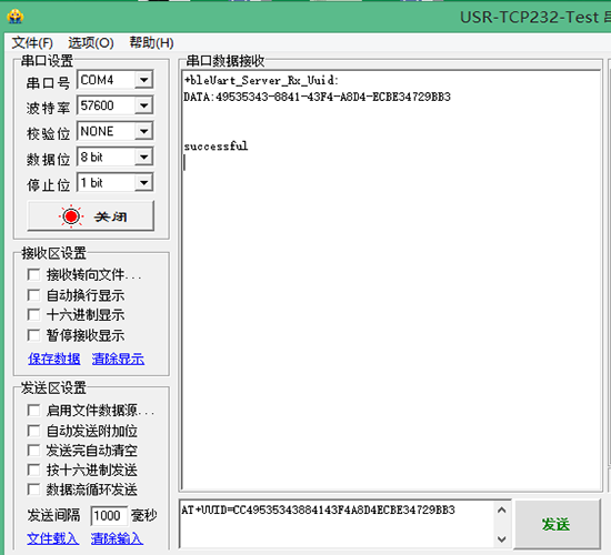 三、進(jìn)入AT指令模式,更改BLE的UUID,3個(gè)UUID全部改完后,設(shè)置BLE工作模式為主模式,然后發(fā)送AT+Z重啟。