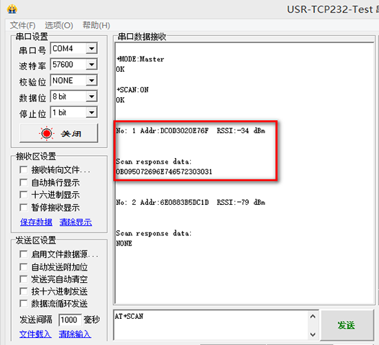 5、紅框中的為藍(lán)牙打印機(jī)的地址,然后發(fā)送AT+CONN=1進(jìn)行連接打印機(jī)