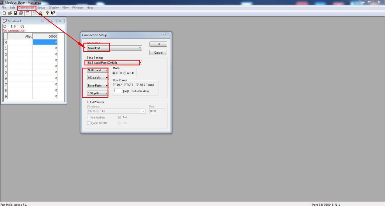 USB-RS232或者USB-RS485串口線接USR-TCP232-304串口和電腦USB口,MODBUS SLAVE軟件打開COM口,模擬客戶串口MODBUS RTU設(shè)備。USR-TCP232-304網(wǎng)線和電腦直連,IP設(shè)置同網(wǎng)段,在電腦安裝USR-VCOM虛擬串口軟件和組態(tài)王。模擬調(diào)試,用組態(tài)王連接串口服務(wù)器,去讀取串口設(shè)備數(shù)據(jù)。