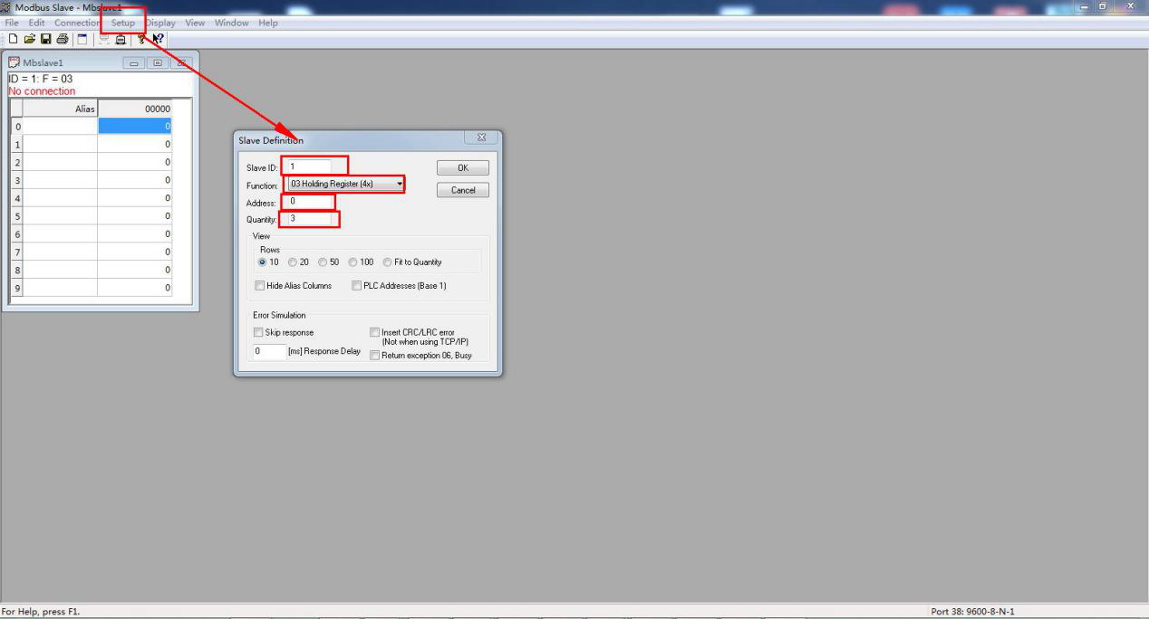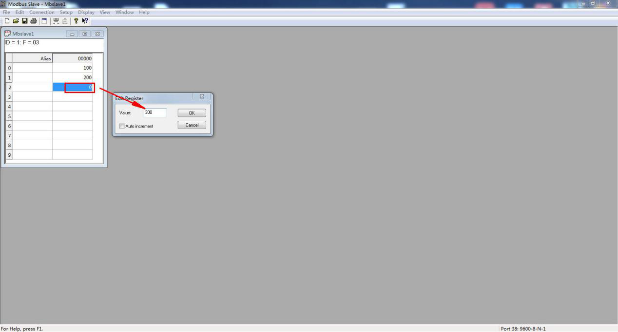 SLAVE ID設(shè)置為1,模擬串口設(shè)備ID 1。用03功能碼。寄存器起始地址設(shè)置0(十進(jìn)制)。寄存器地址數(shù)量是3。點(diǎn)擊寄存器地址,可以修改寄存器地址中的參數(shù),依次先設(shè)置100、200、300。
