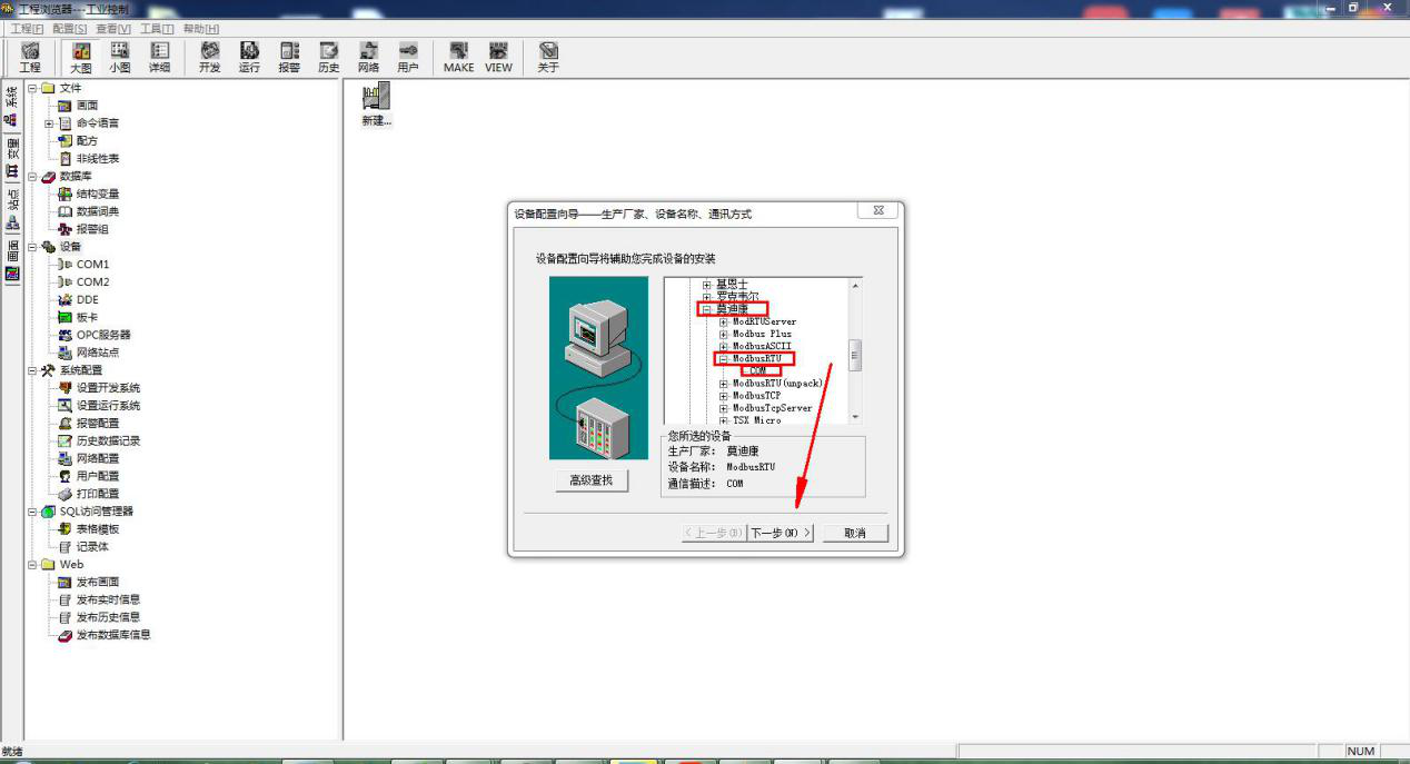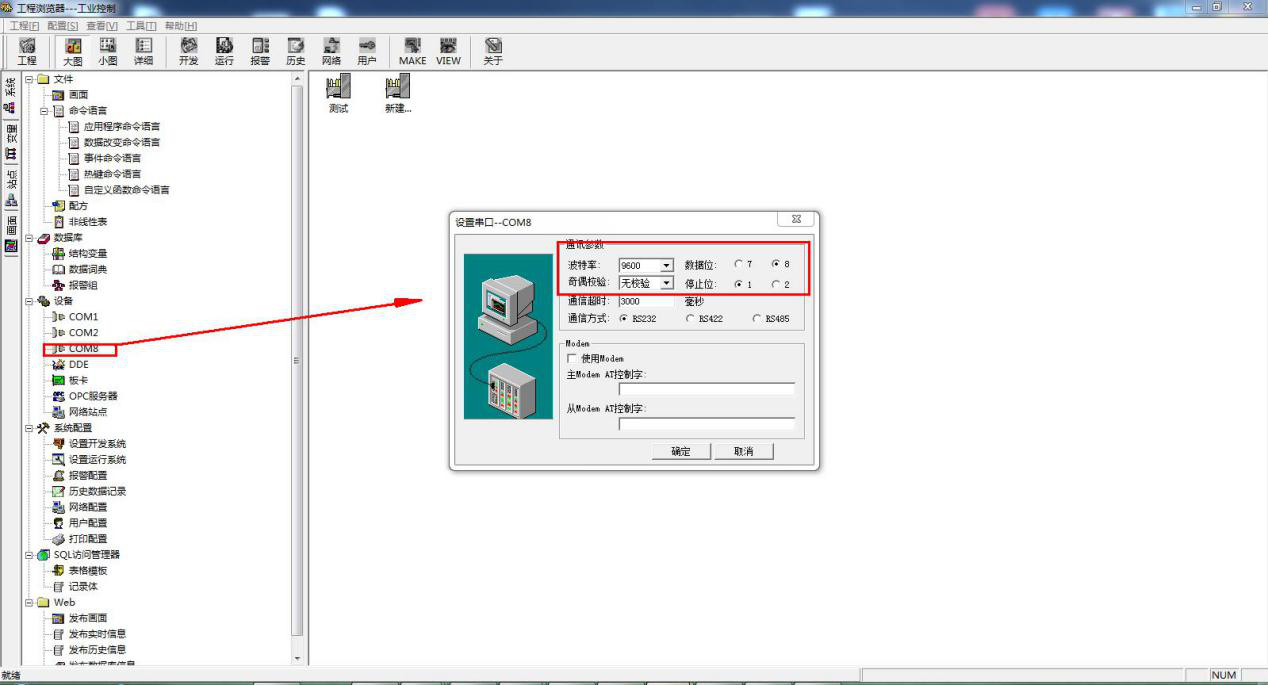 點(diǎn)擊設(shè)備,新建一個(gè)組態(tài)設(shè)備,選擇 Modbus RTU 標(biāo)準(zhǔn)協(xié)議的莫迪康 PLC。 下一步,選擇使用虛擬串口 COM8,下一步輸入設(shè)備ID 1。點(diǎn)擊新建的COM8設(shè)備,還可以修改串口參數(shù),設(shè)置和USR-TCP232-304的串口參數(shù)一致。通訊方式可以根據(jù)串口設(shè)備,選擇RS232或者RS485。