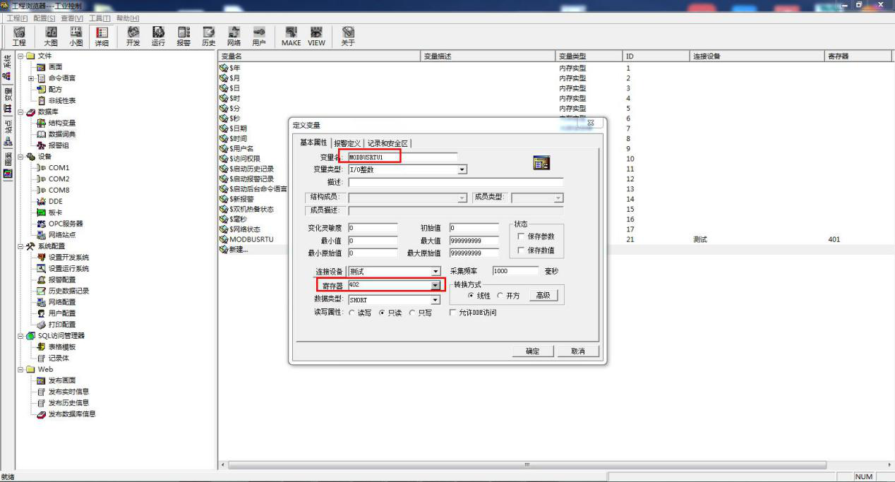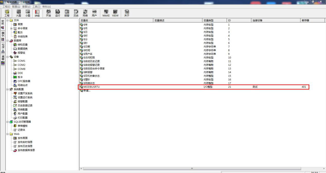 新建變量名 MODBUSRTU,選擇變量類型 IO 整數(shù)。連接設(shè)備為新建的設(shè)備名:新建 IO 設(shè)備,寄存器 401,代表功能碼為 03,起始地址 0 的第一個(gè)值