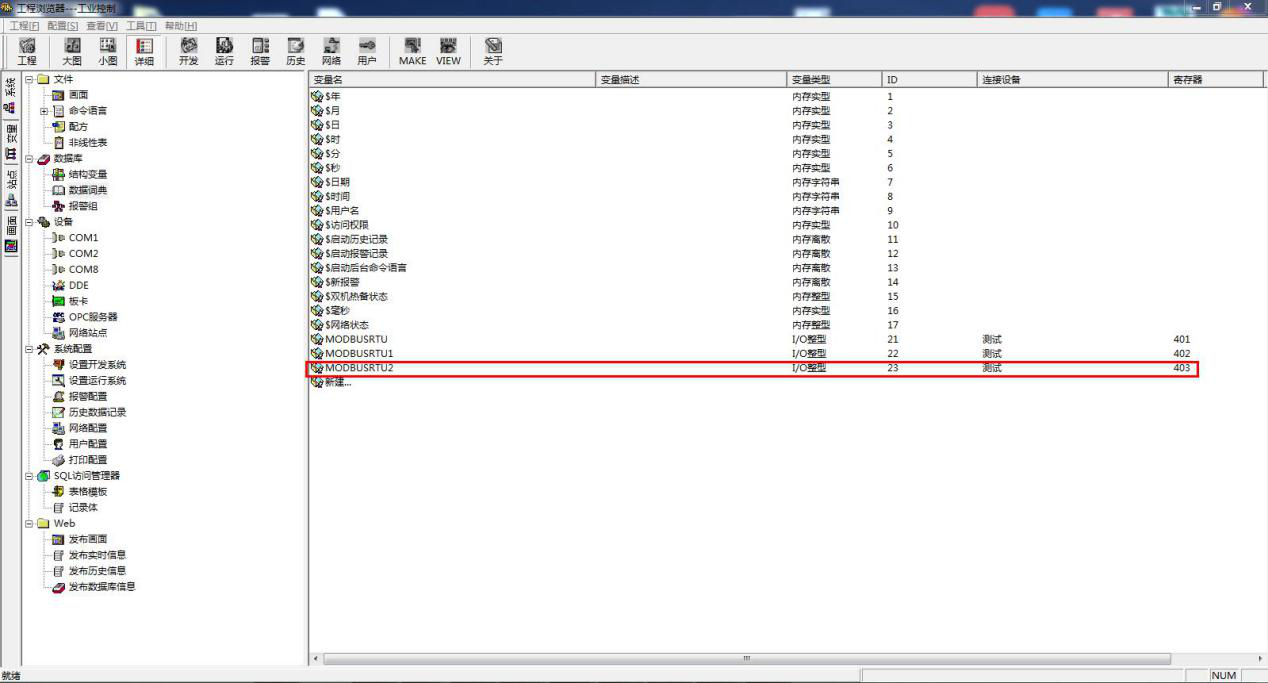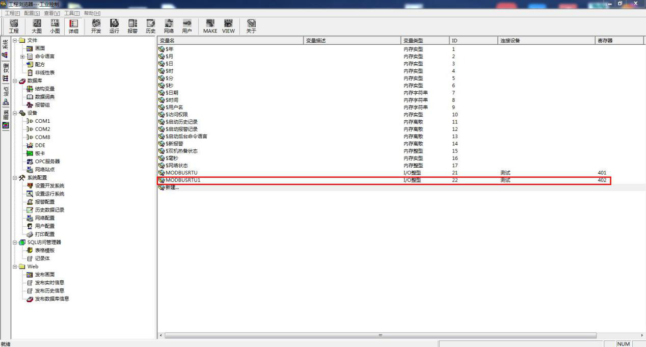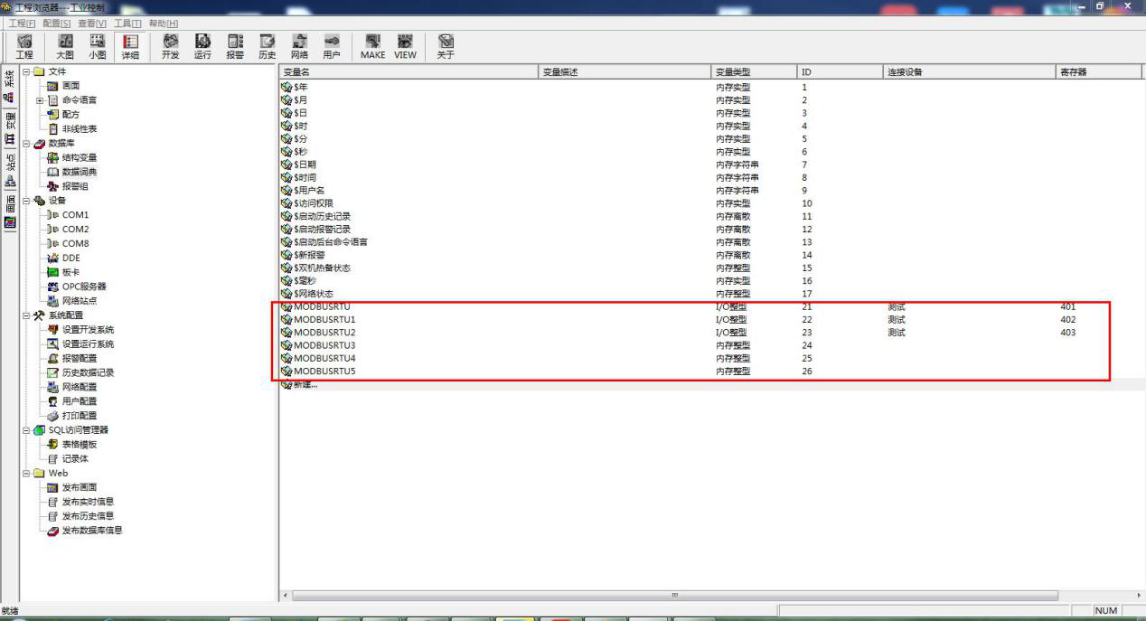 新建了 6 個(gè)變量,三個(gè) IO 變量,分別采集串口設(shè)備數(shù)據(jù)。三個(gè)內(nèi)存變量。